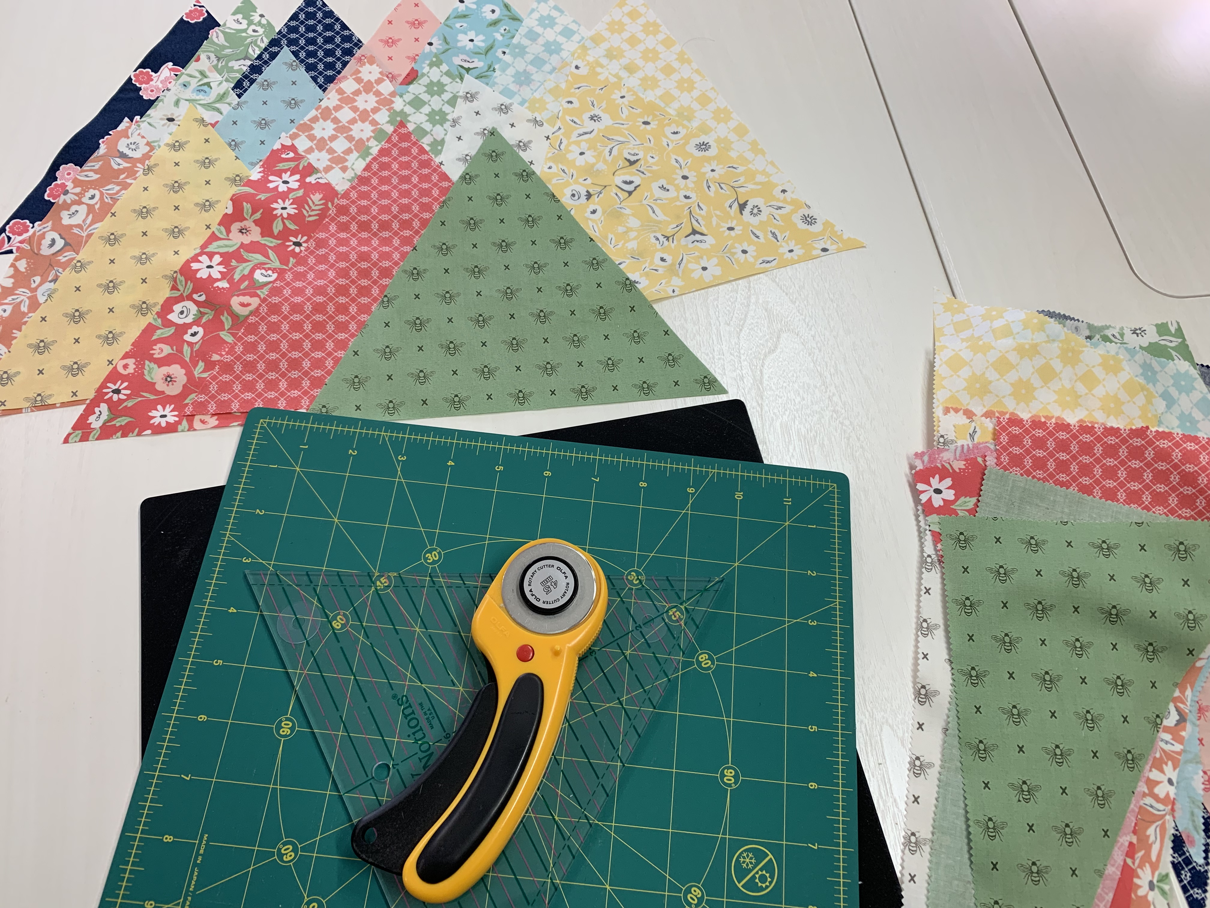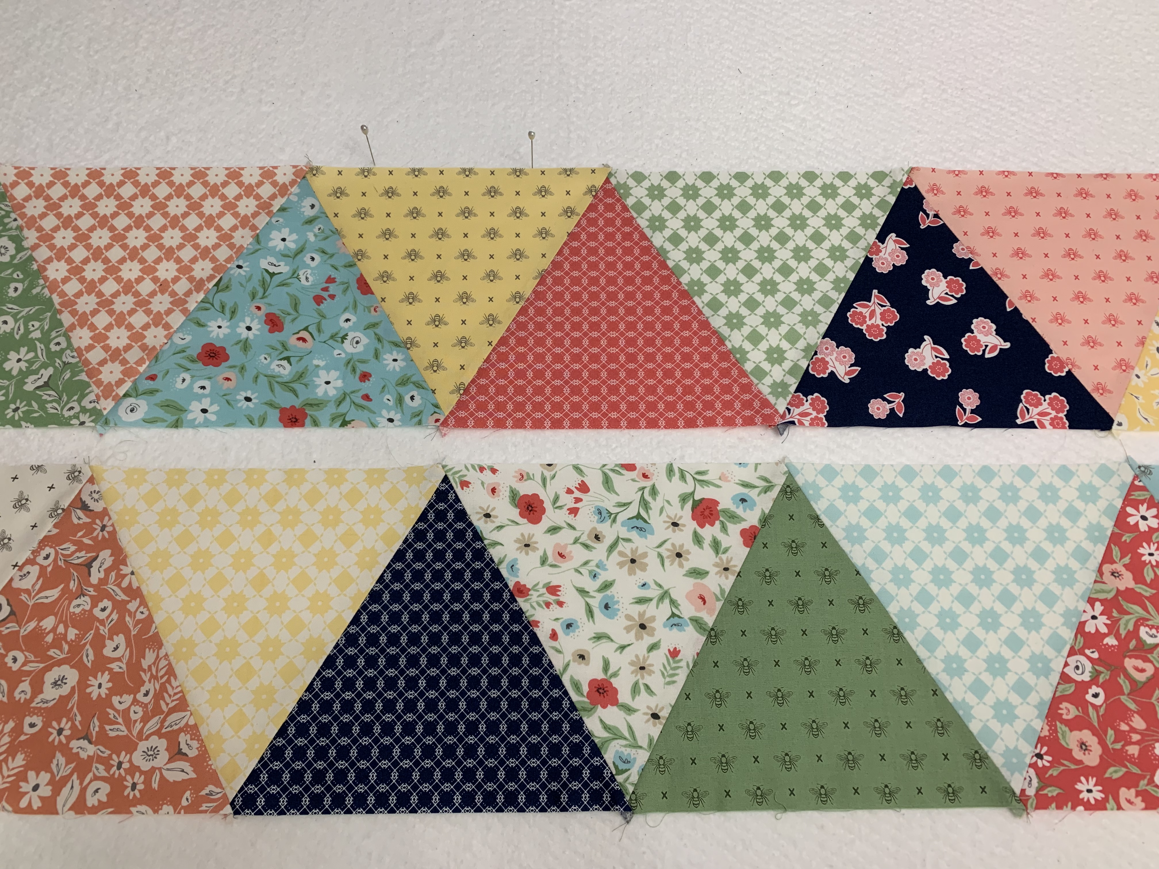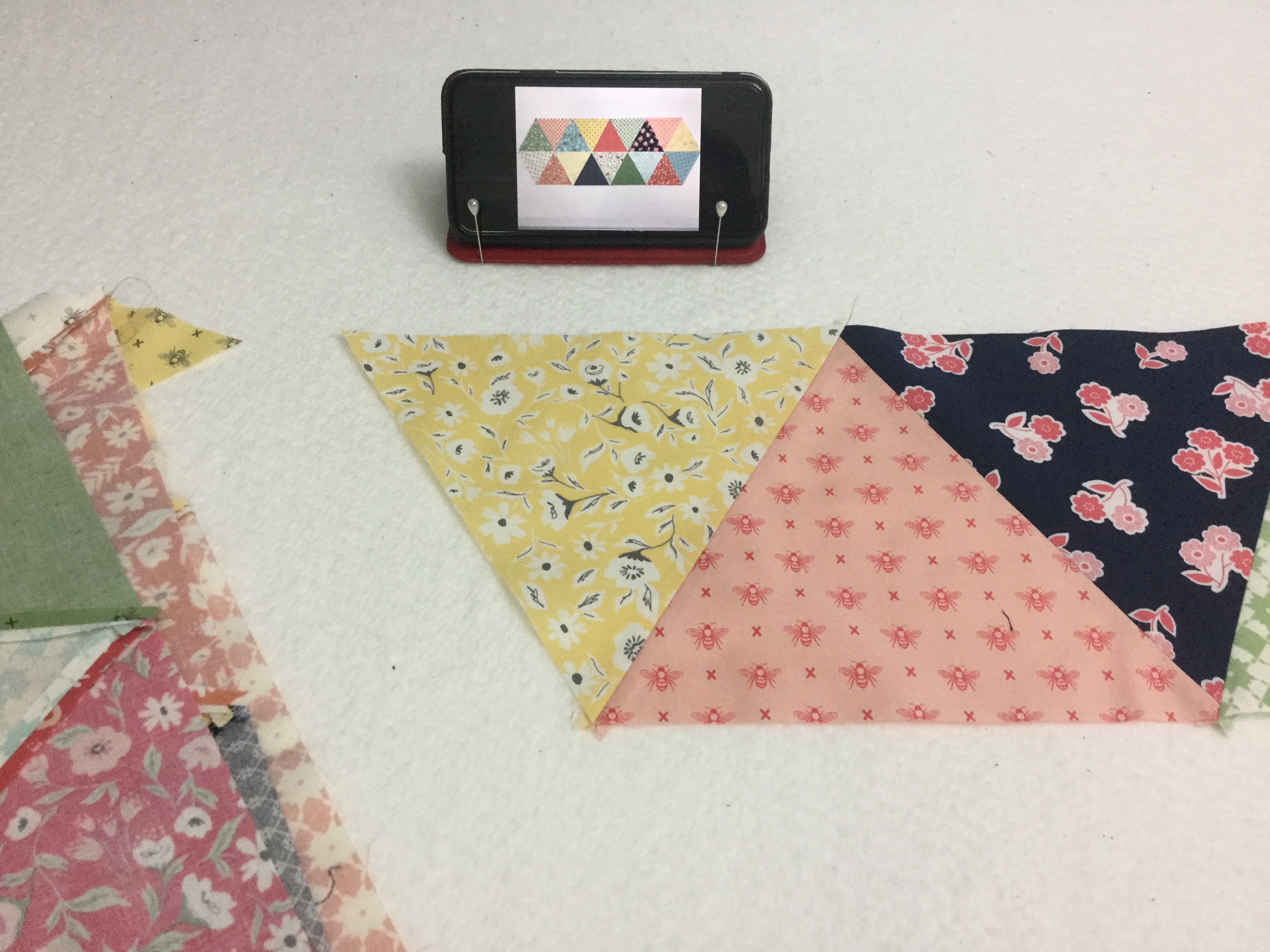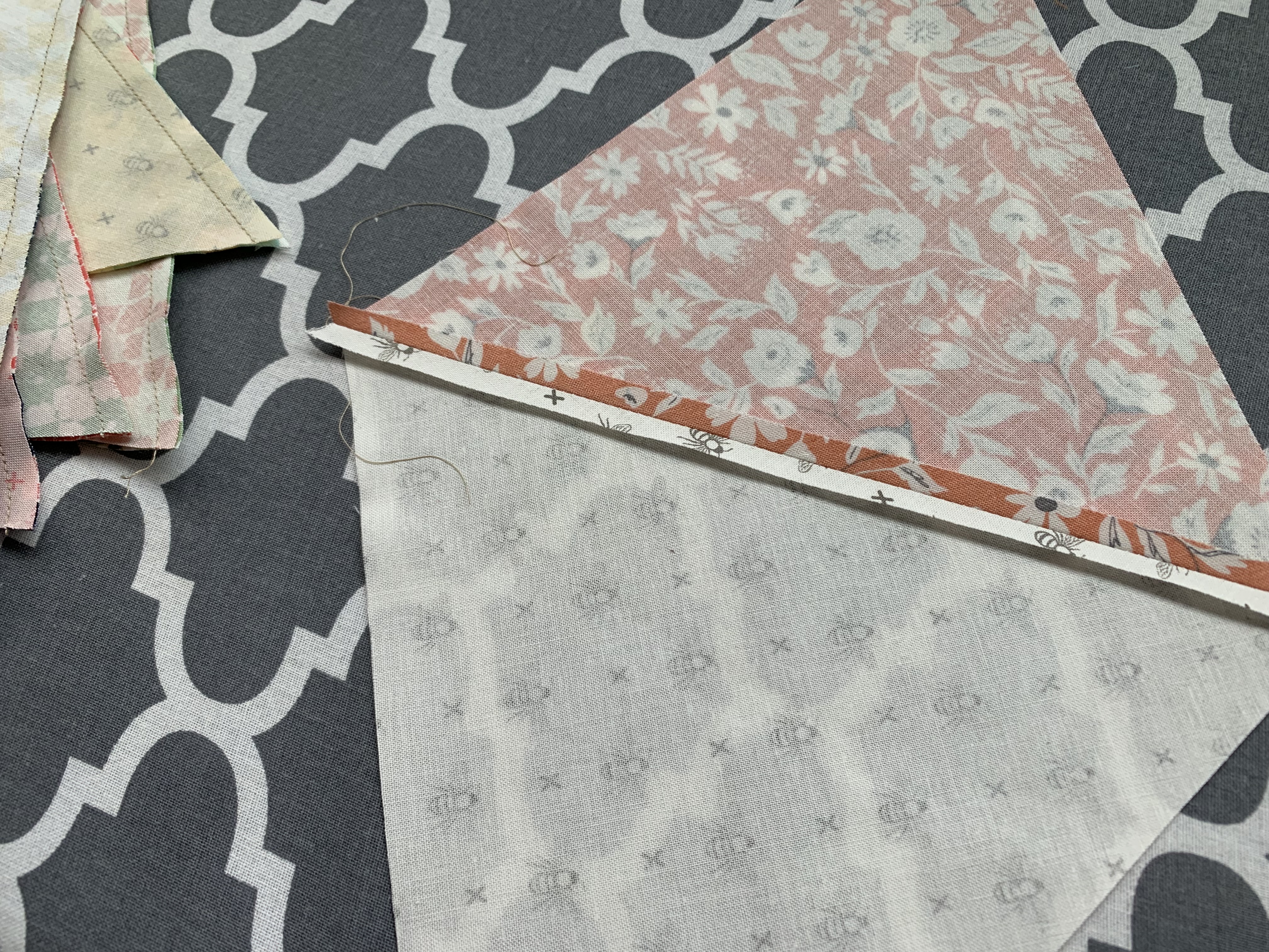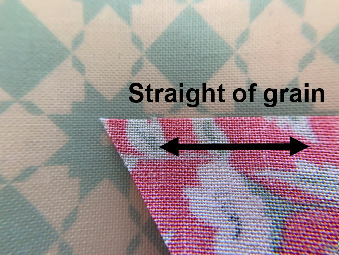4. When working with a bias edge, as there are on these triangles on two sides, try to keep the straight of the grain to the outside edge. Putting it on the outside edge will help the project lay flat and straight when putting the binding on.