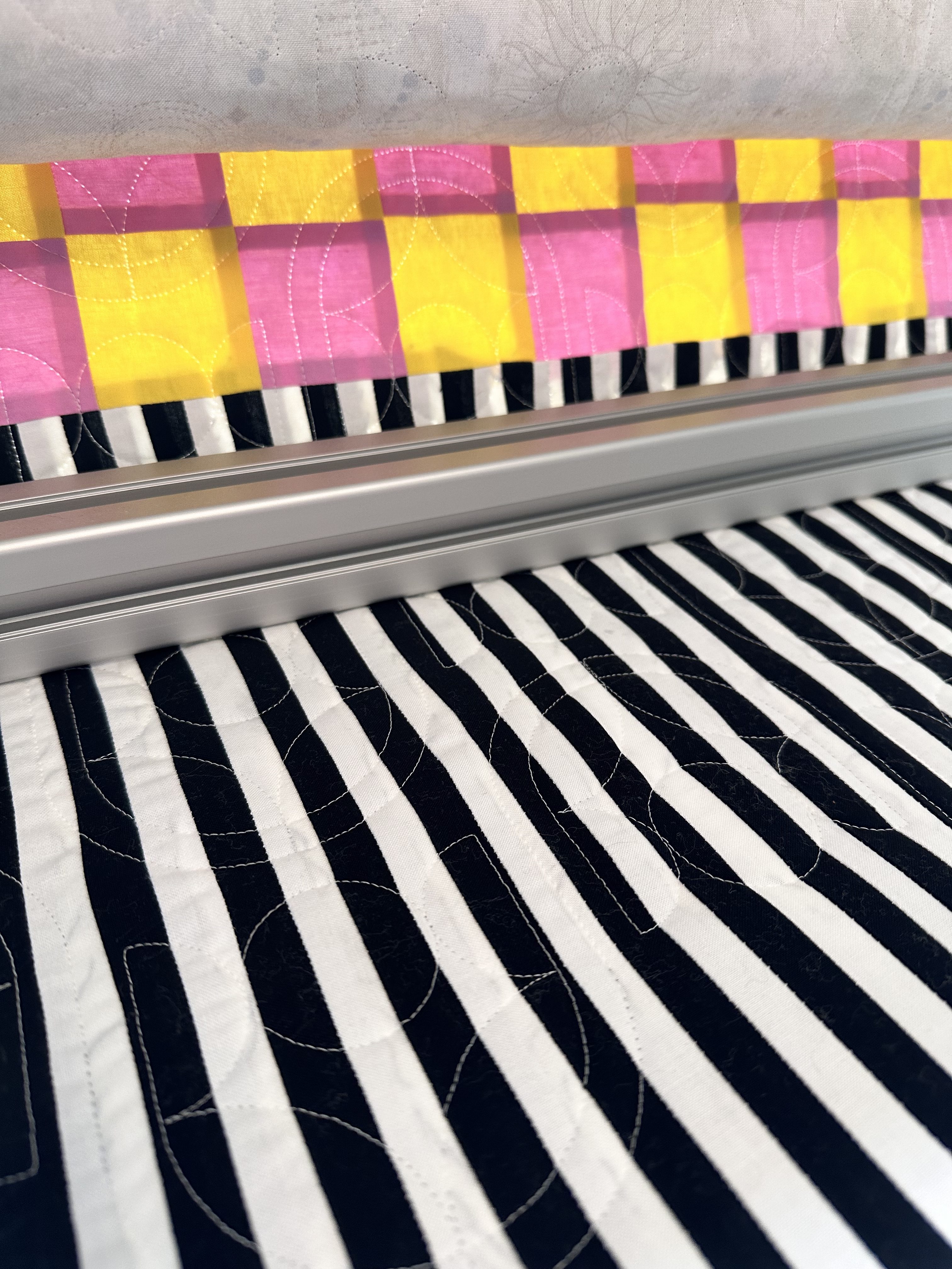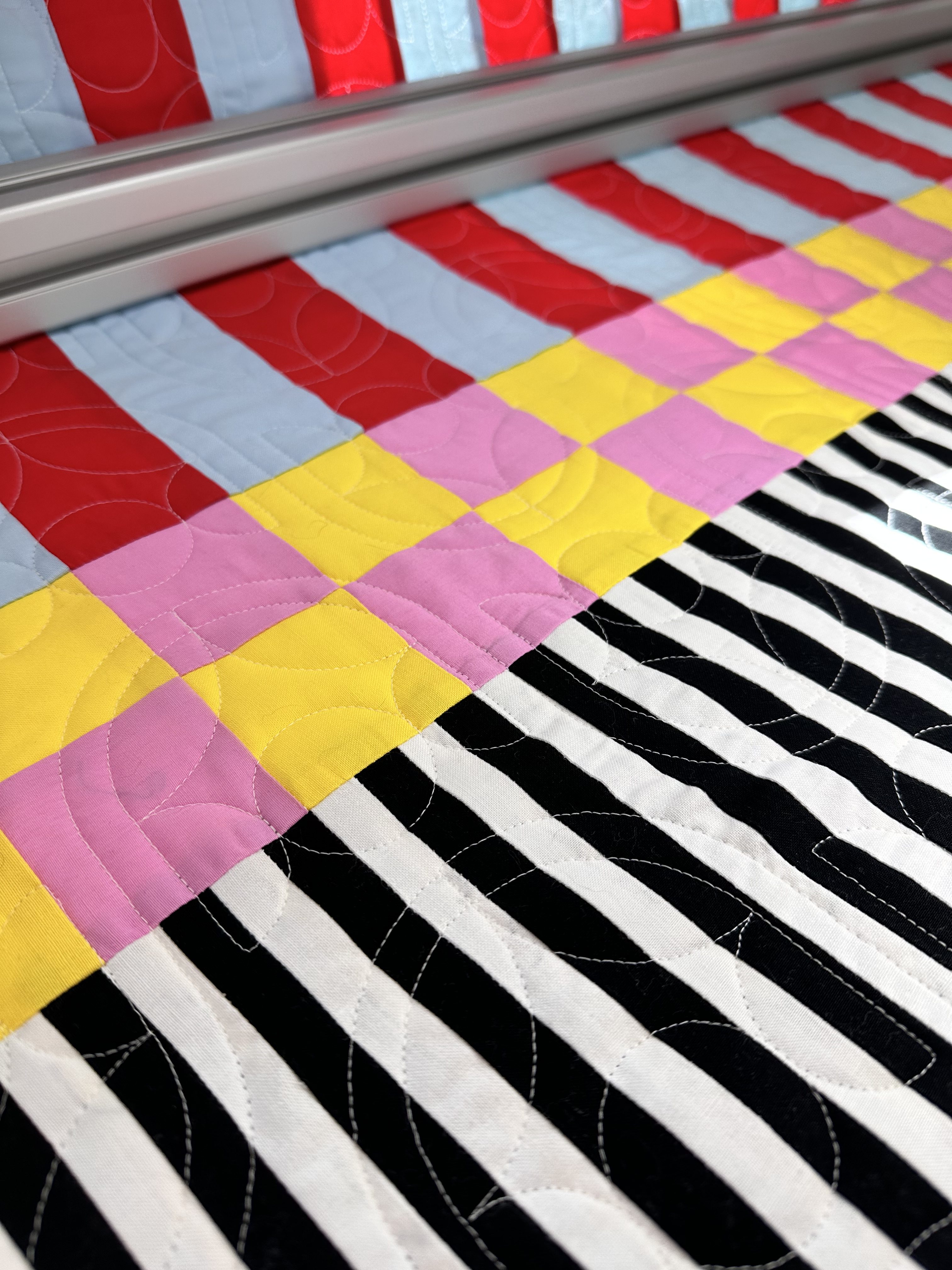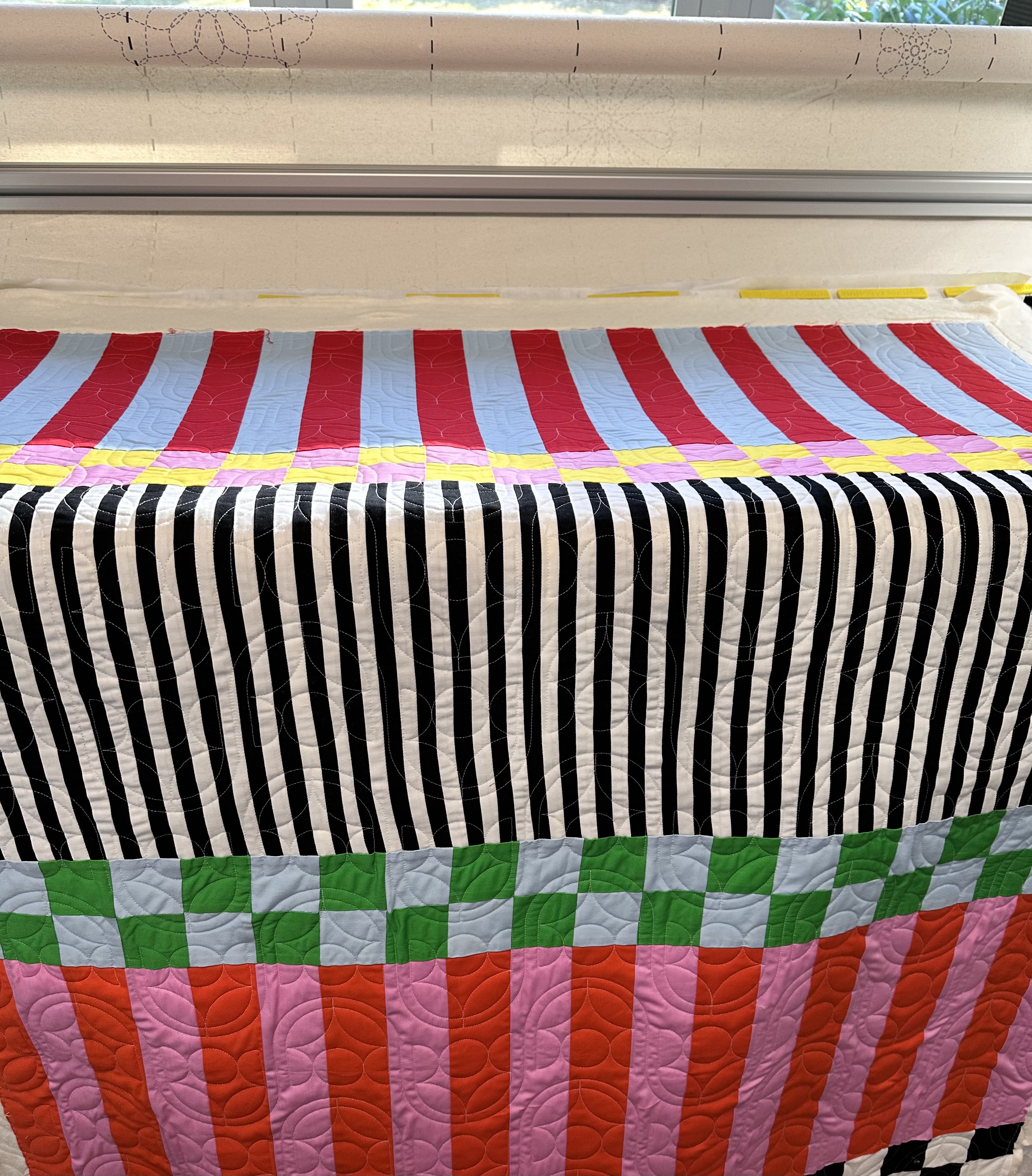 As a longarmer, I like having open communication with the quilt top maker. In quilting Jaclyn’s quilts, I texted her photos of the quilts with different thread options to get alignment before beginning the quilting. This was after an initial video conference where we discussed pantograph designs and thread colors. I want my clients to be happy, and frequent communication helps with that.