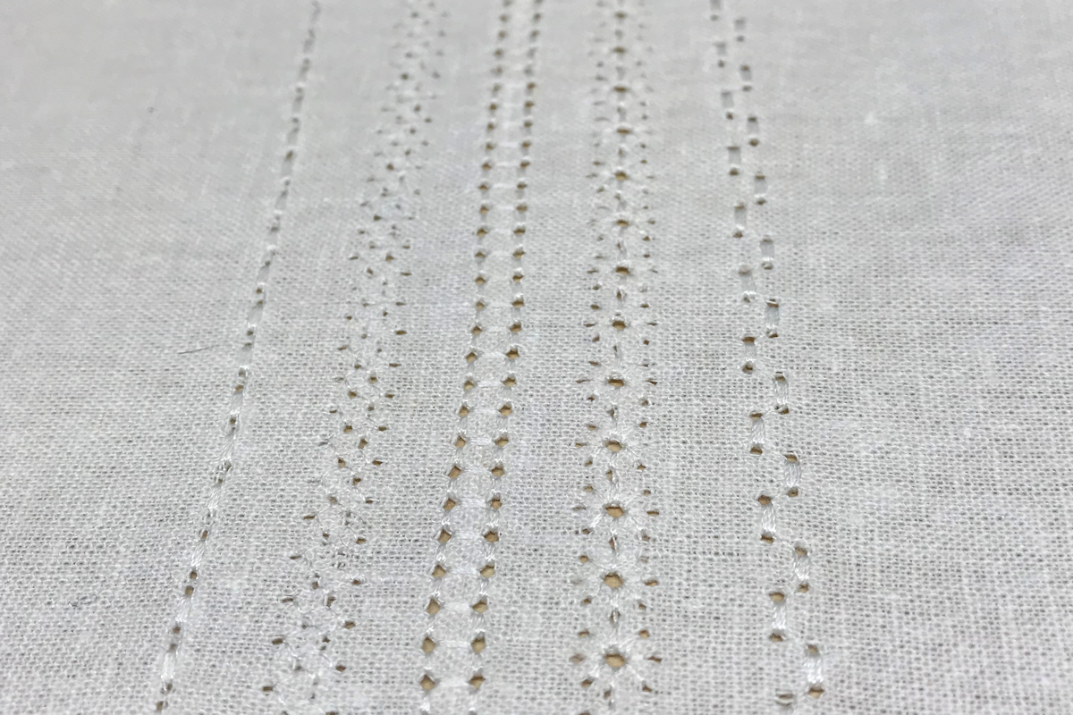When selecting a stitch for this technique, look for one that goes in and out of the same holes several times. Something as simple as a triple straight stitch creates a delicate line of hemstitching. As the needle creates the stitch, it makes the holes and embroiders them. Typically, you use a thread color that matches the fabric because the want the emphasis to be on the holes and the texture you are creating and not the thread. Use a fine thread – 60-80 weight for delicate look. If you use heavier threads , the holes will not be as visible. The stitches used here are #6, #8, #702, 711, and 709. These are just few that work with for hemstitching so feel free to explore and stitch until you find what you like.
