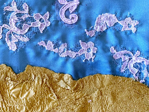 Lay the mountain art onto the bed of the sewing machine and scatter the lace across the sky. It should look pleasing to the eye. You want the clouds to look natural. I try to make them appear as if they’re dancing across the mountains. You don’t need many clouds—just enough to add interest to your art.