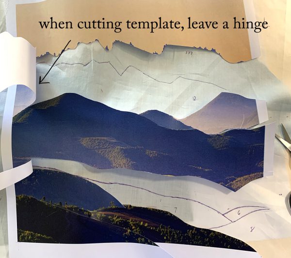 Carefully cut the sky and mountains beginning from right to left leaving them still attached and hinged to the left side of the photo. This is done in order to flip and trace each shape. It is now referred to as the TEMPLATE.