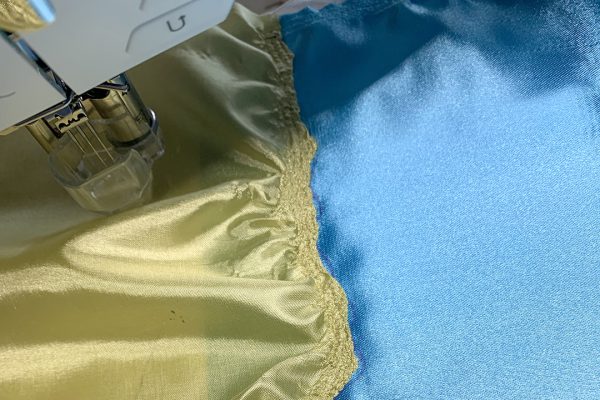 Carefully begin to embellish the three outside edges of the sky leaving the bottom open. It should have a slight puckering on the edges only.