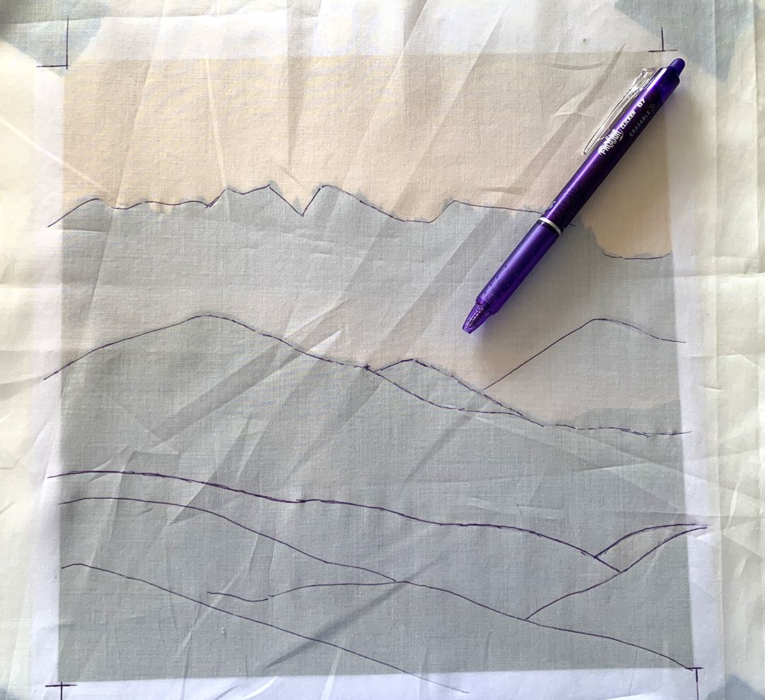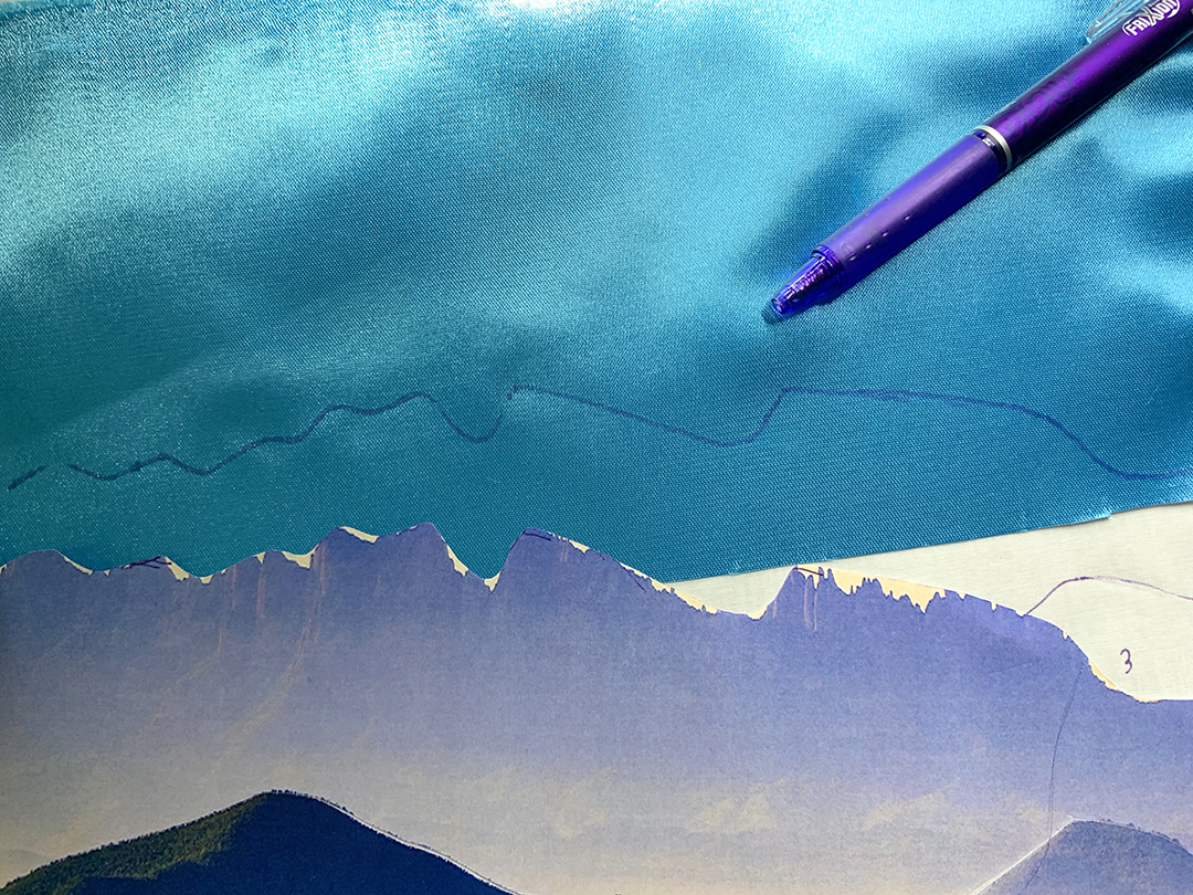 Beginning with the mountain ridge closest to the top, lay the template over the embellished sky fabric, and trace the top edge of the first mountain.