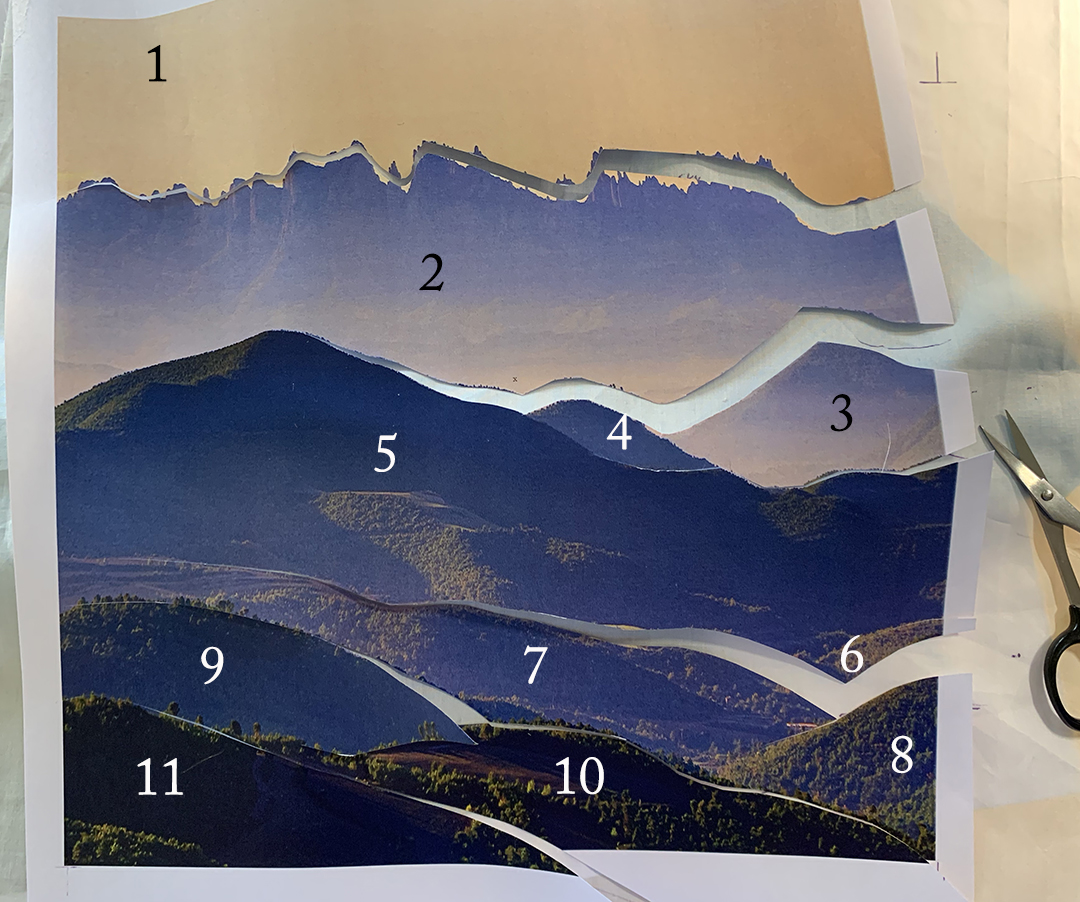 Carefully cut the sky and mountains beginning from right to left leaving them still attached and hinged to the left side of the photo. This is done in order to flip and trace each shape. It is now referred to as the TEMPLATE.