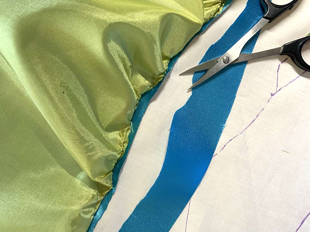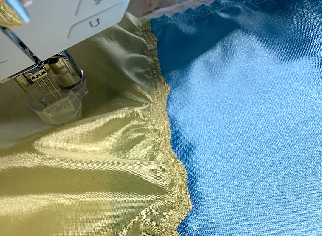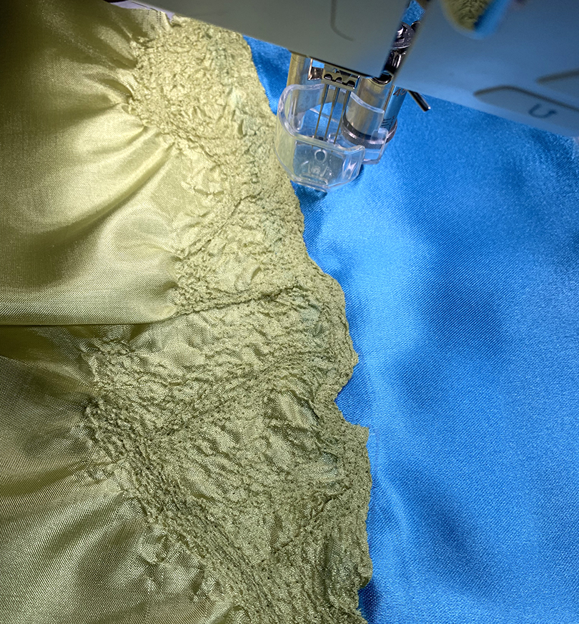 Carefully begin to embellish the three outside edges of the sky leaving the bottom open. It should have a slight puckering on the edges only.