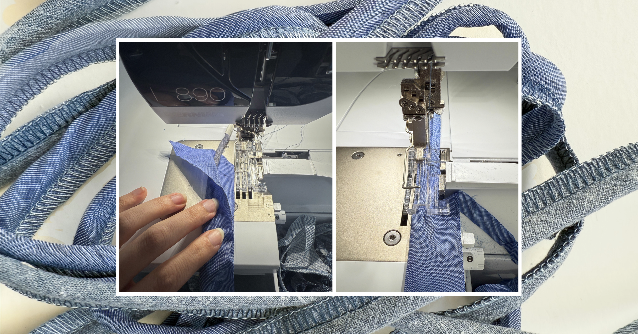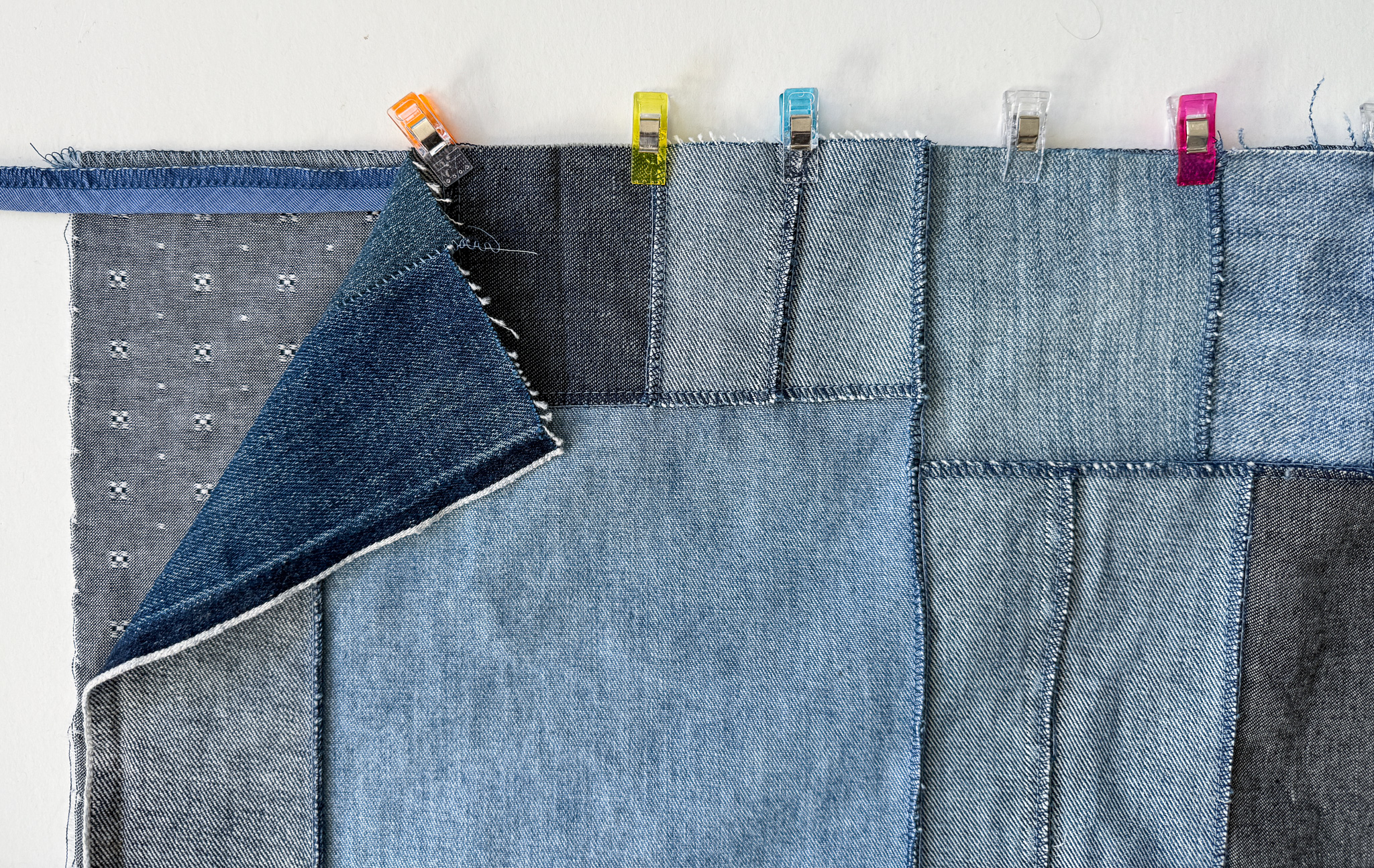Zero-waste tip: Who says your piping needs to be all one fabric? I mixed scraps from a men’s chambray shirt and one large scrap of a denim-looking weave to create my piping. I cut the longest 2″ strips I could (on the diagonal/bias) and then used the overlock to attach them all together to make one long piece of bias binding.