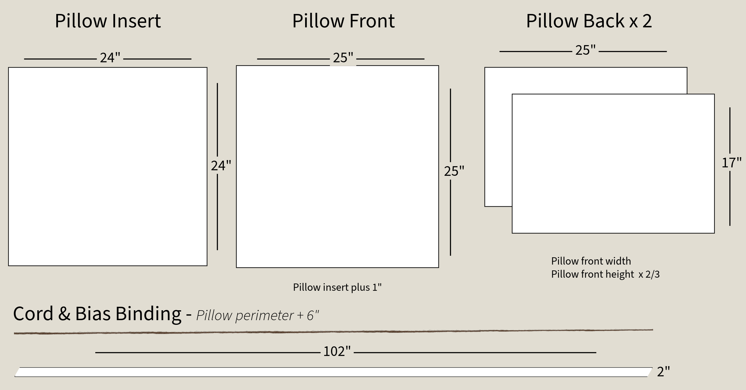 I used a 24″ by 24″ pillow insert, and the below dimensions are based on that, but I’ve included some easy math so you can figure out what size materials you need from whatever pillow you chose to use!