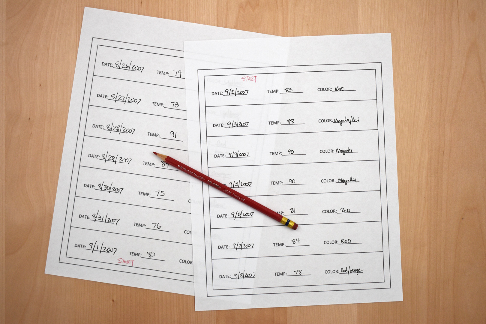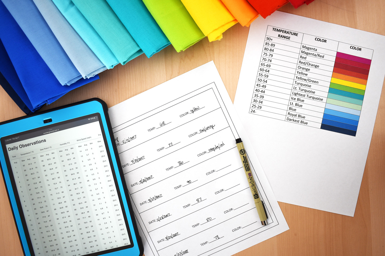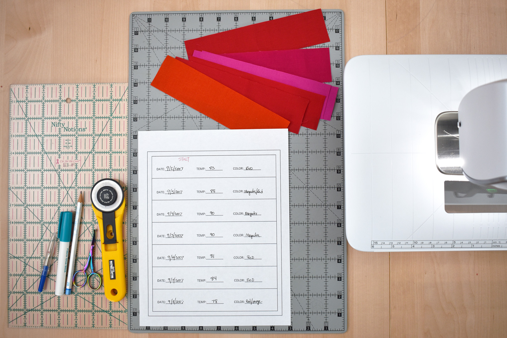 Here’s what you will need to create a temperature quilt using the templates. Grab your 56 printed templates, a regular pencil with eraser, a red pencil or highlighter, your temperature/color chart (and a device to display online weather data for historical temps).