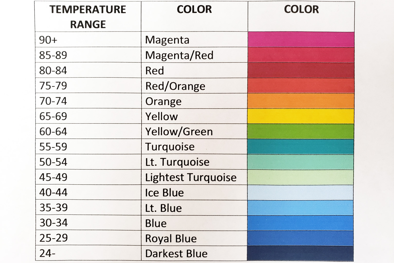 You will need to plan for at least 15 colors to make an interesting temperature quilt, and these colors represent a specific range of temperatures. Begin by deciding the temperature range, which should be a minimum of 15 different temperature ranges. If you use less than 15 colors, there will not be enough variety with the color range and the final quilt will look more like big blocks of just a few colors. Look at my simple temperature range and color chart below.