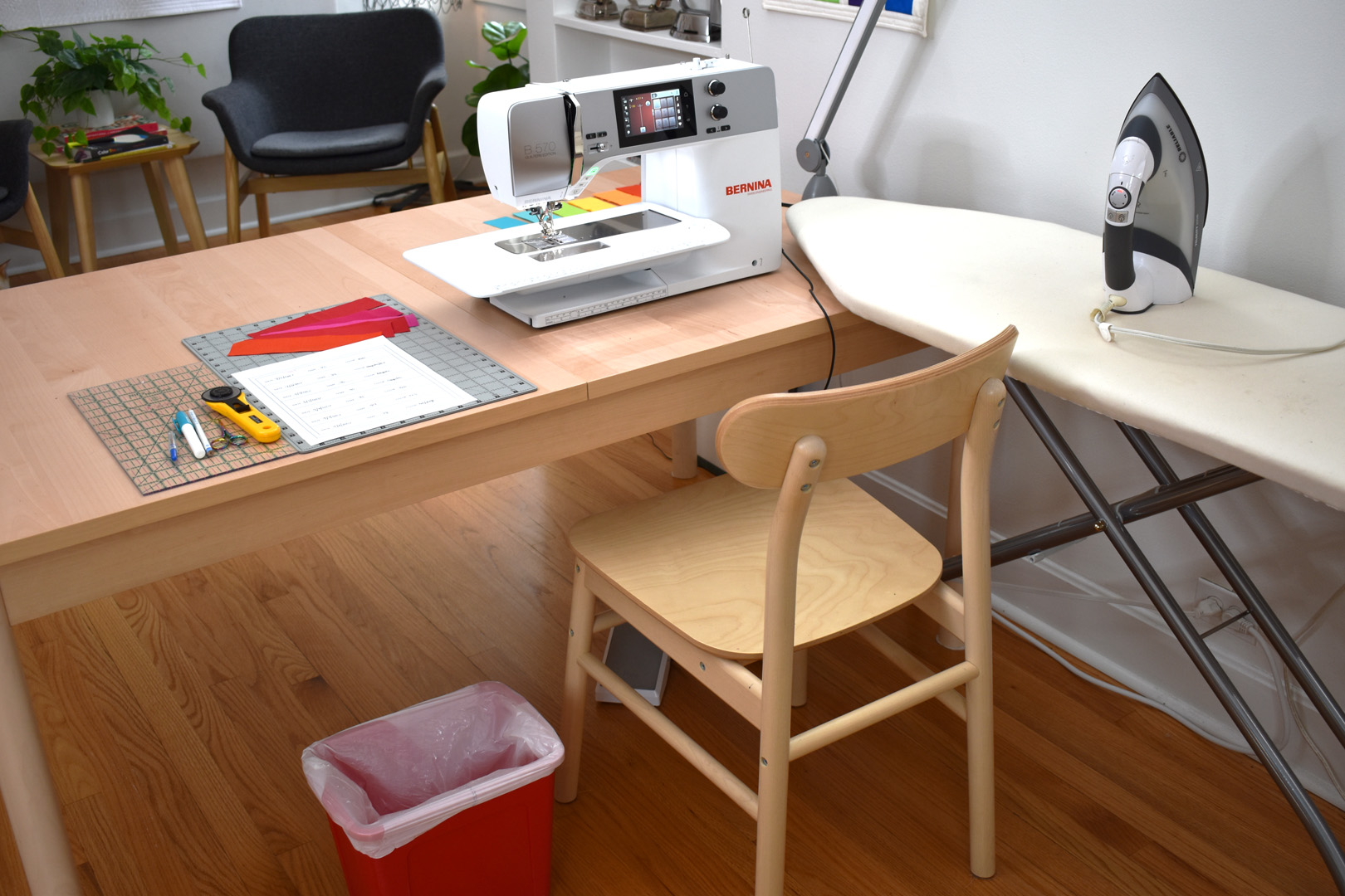 You will be pressing each seam after sewing, and if you can set up a pressing surface next to your machine this will make the process go faster (and keep you from a lot of up-and-down while sewing). Also, a good tip is to have a trash can handy, as you’ll be making a lot of little cut-offs during the process.