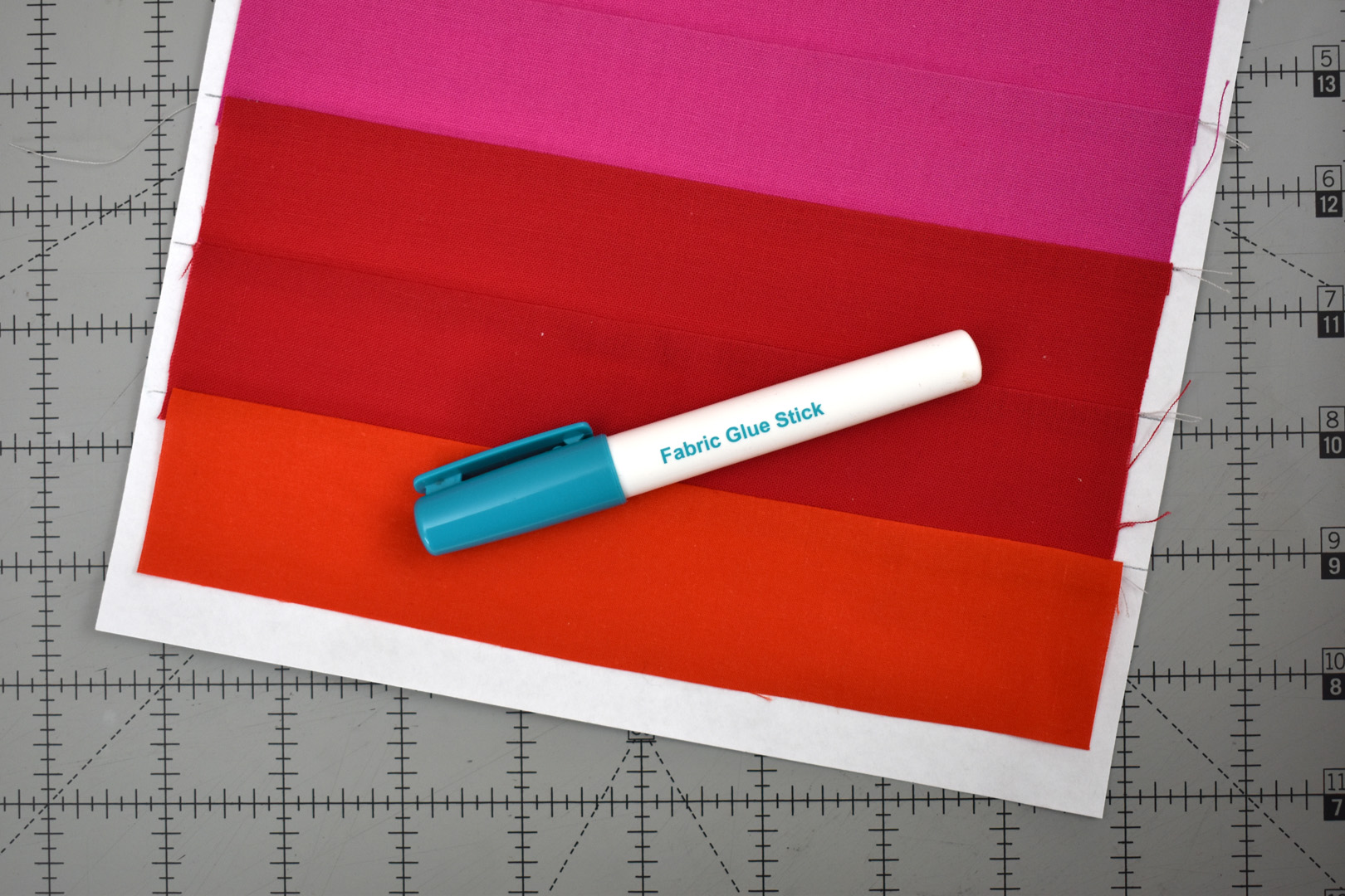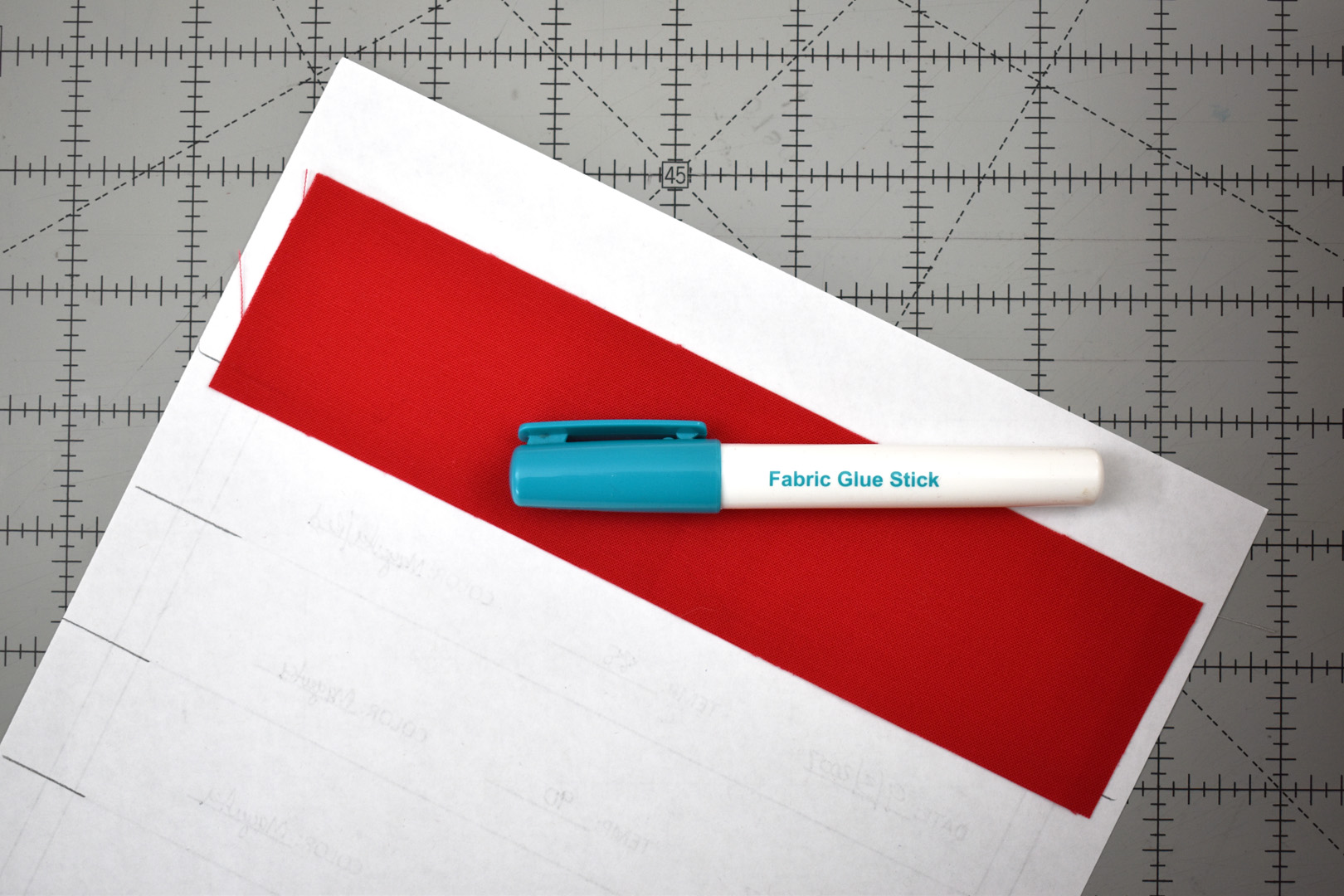 Use your glue stick to hold the fabric in place once you have it lined-up. A word about using the glue stick; use just enough to hold the fabric in place, and no more. Too much glue will make it difficult to remove the paper in later steps. You can always add an extra dab of glue, but you can’t take it away.