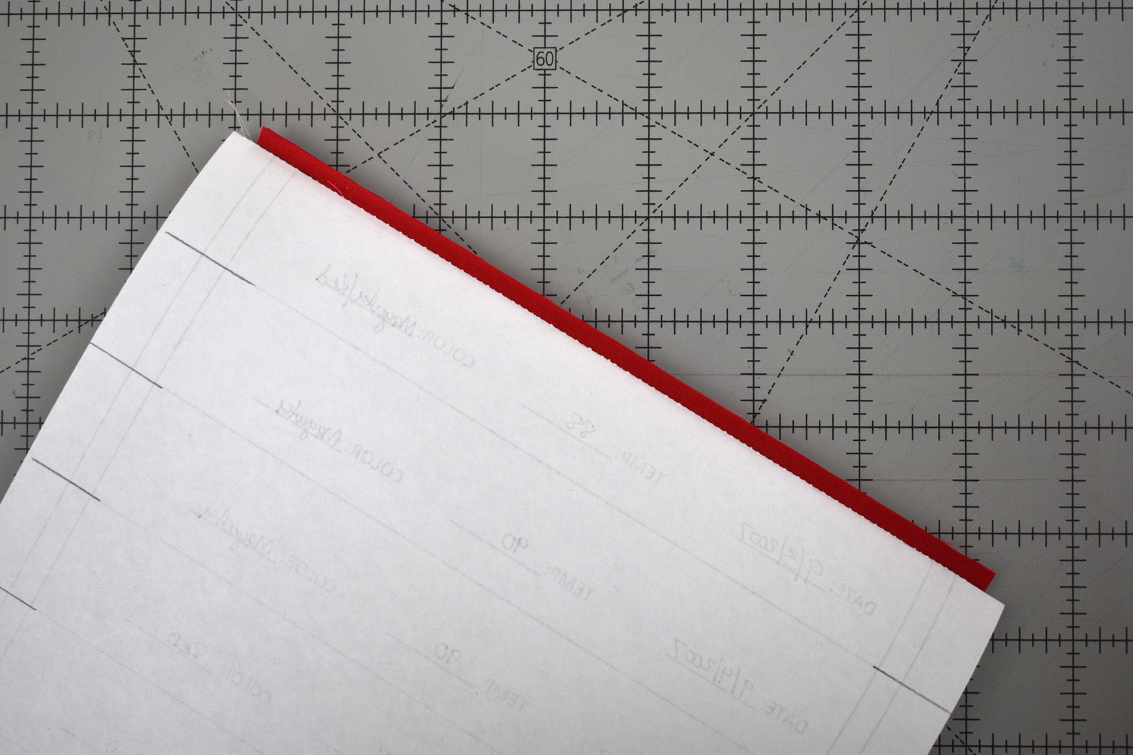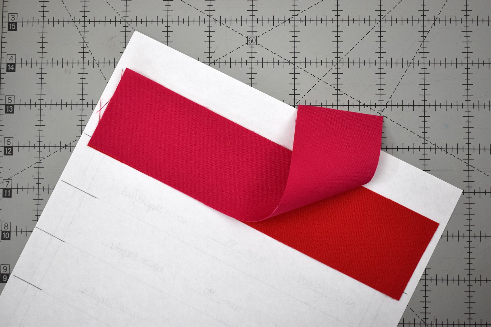On the back side of the paper pattern, use a pencil and ruler to extend the red stitching lines to the edge of the paper. This will help you determine where to place the next piece of fabric on the back of the paper. You may not need to do this step after getting the hang of using the paper pattern.