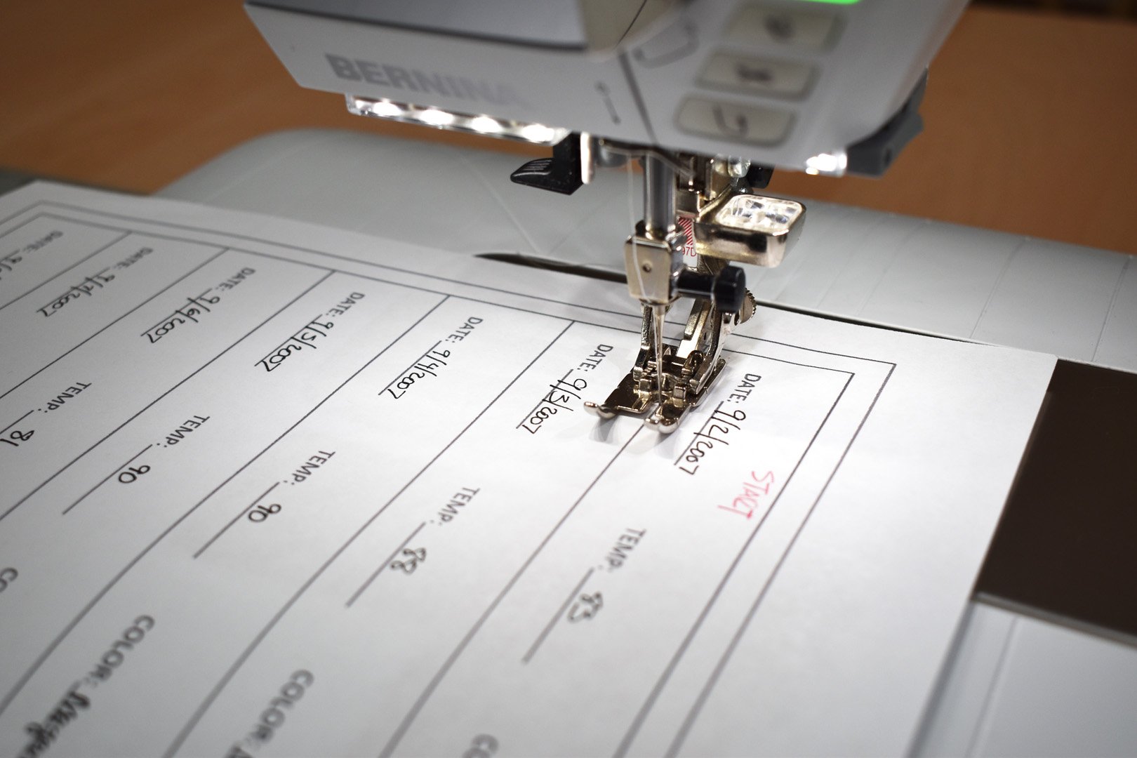 Set up your sewing machine with a neutral color thread such as a medium gray, tan, or dark cream. I use a 100% polyester all-purpose sewing thread for piecing a quilt that I know will get lots of use, and multiple washes. Use your favorite BERNINA patchwork foot, I am using Patchwork Foot #97D with Dual Feed. Install a straight stitch needle plate for this project. Use a small straight stitch with the paper pattern to help create a nice perforation, it will make pulling the paper backing off in the last steps a lot easier.