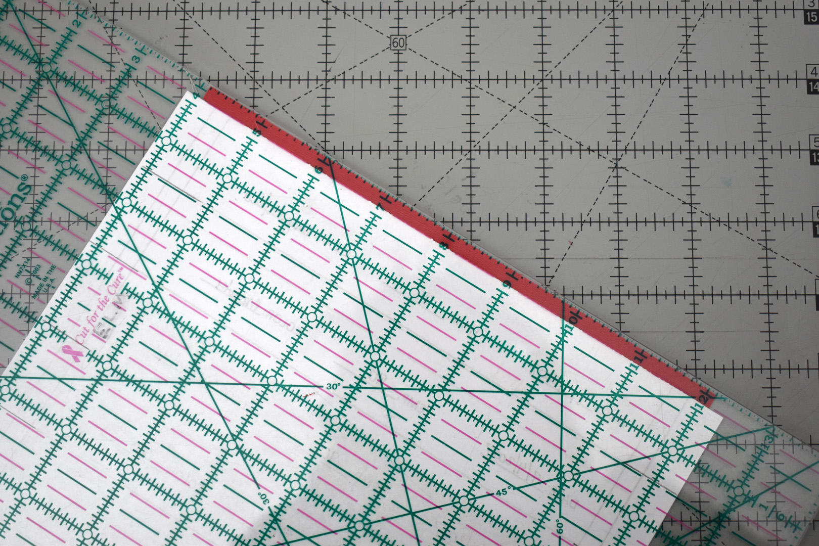 Bring the stitched template back to the cutting mat next to your machine. Fold the long end of the template over at the stitching line to reveal the seam allowance.