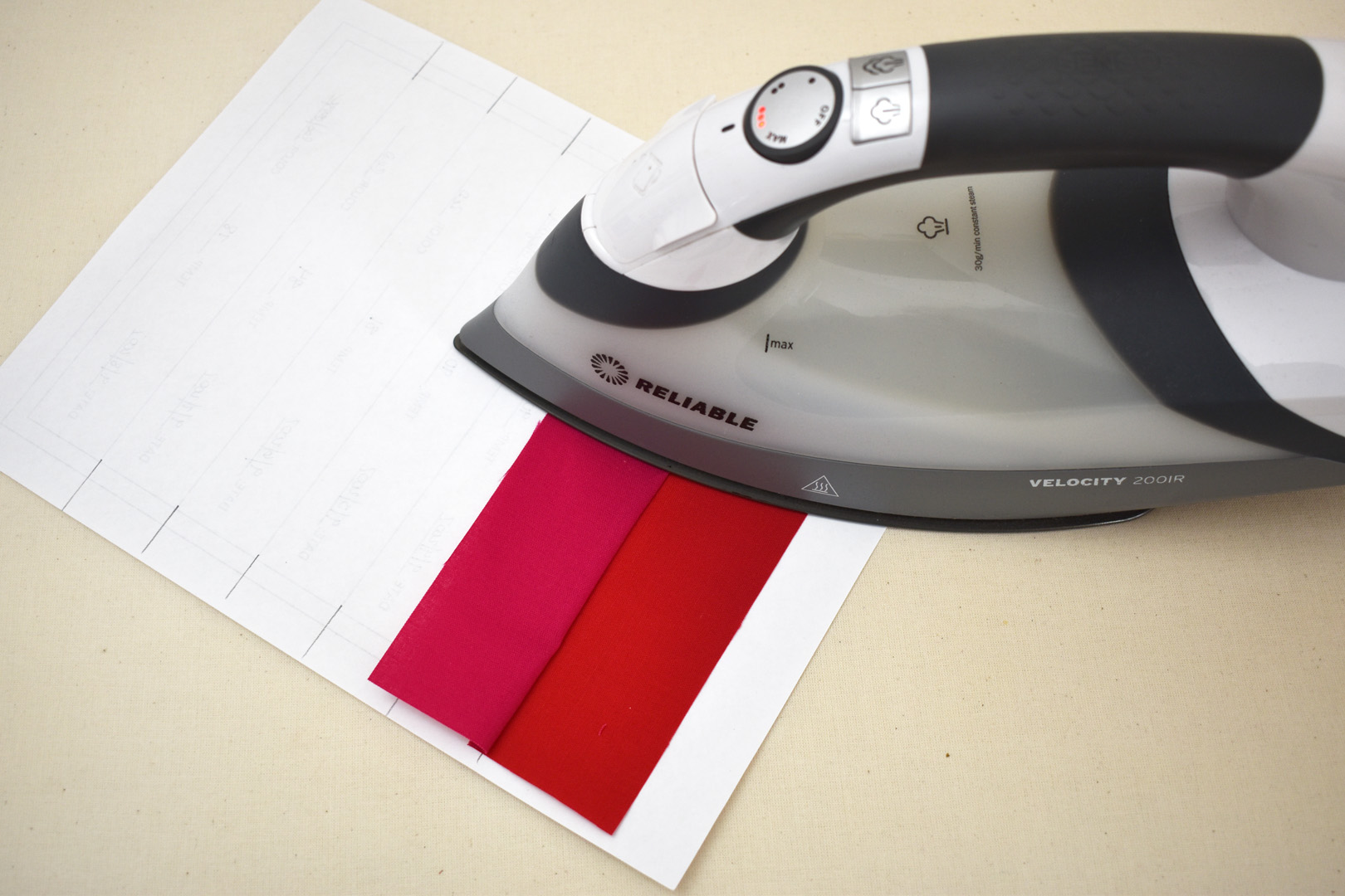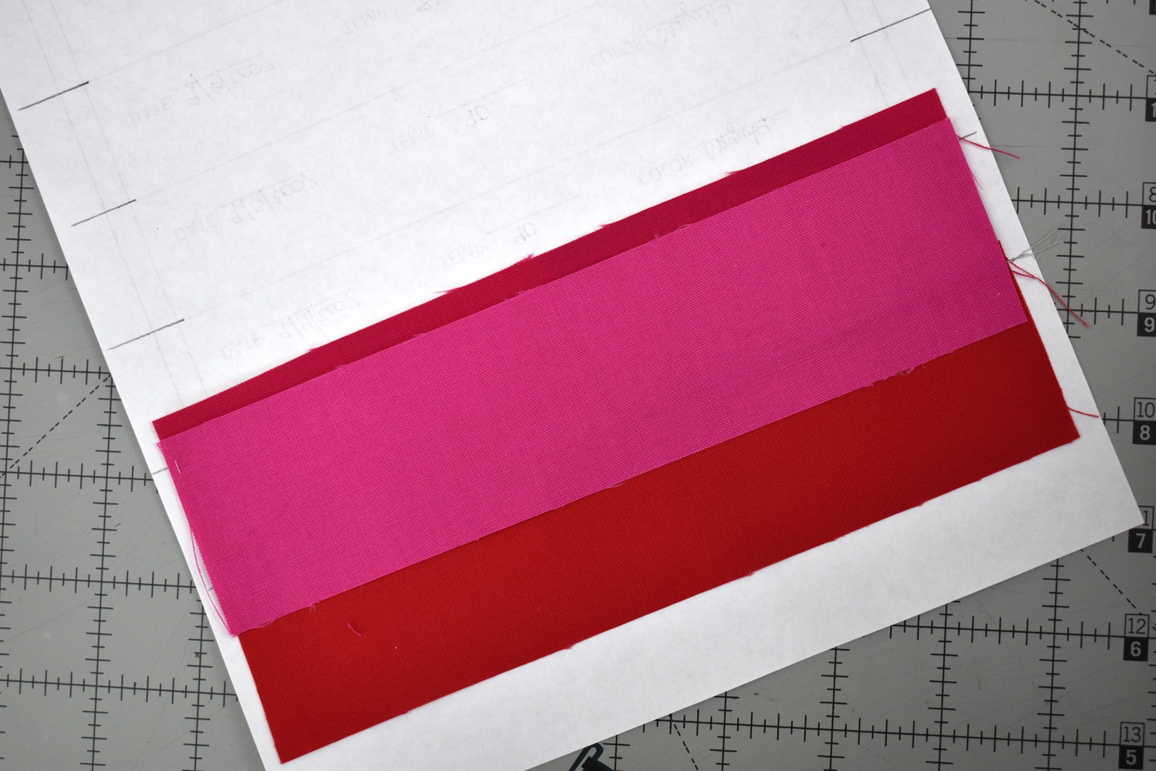 Grab the color needed for the next section of the paper template, and lay it exactly on top of the first piece. Carefully flip the template over, printed side up, holding on tight to the fabric strips on the back side to keep them from shifting. Add a few pins through the top of the template if needed to secure the fabric in place.