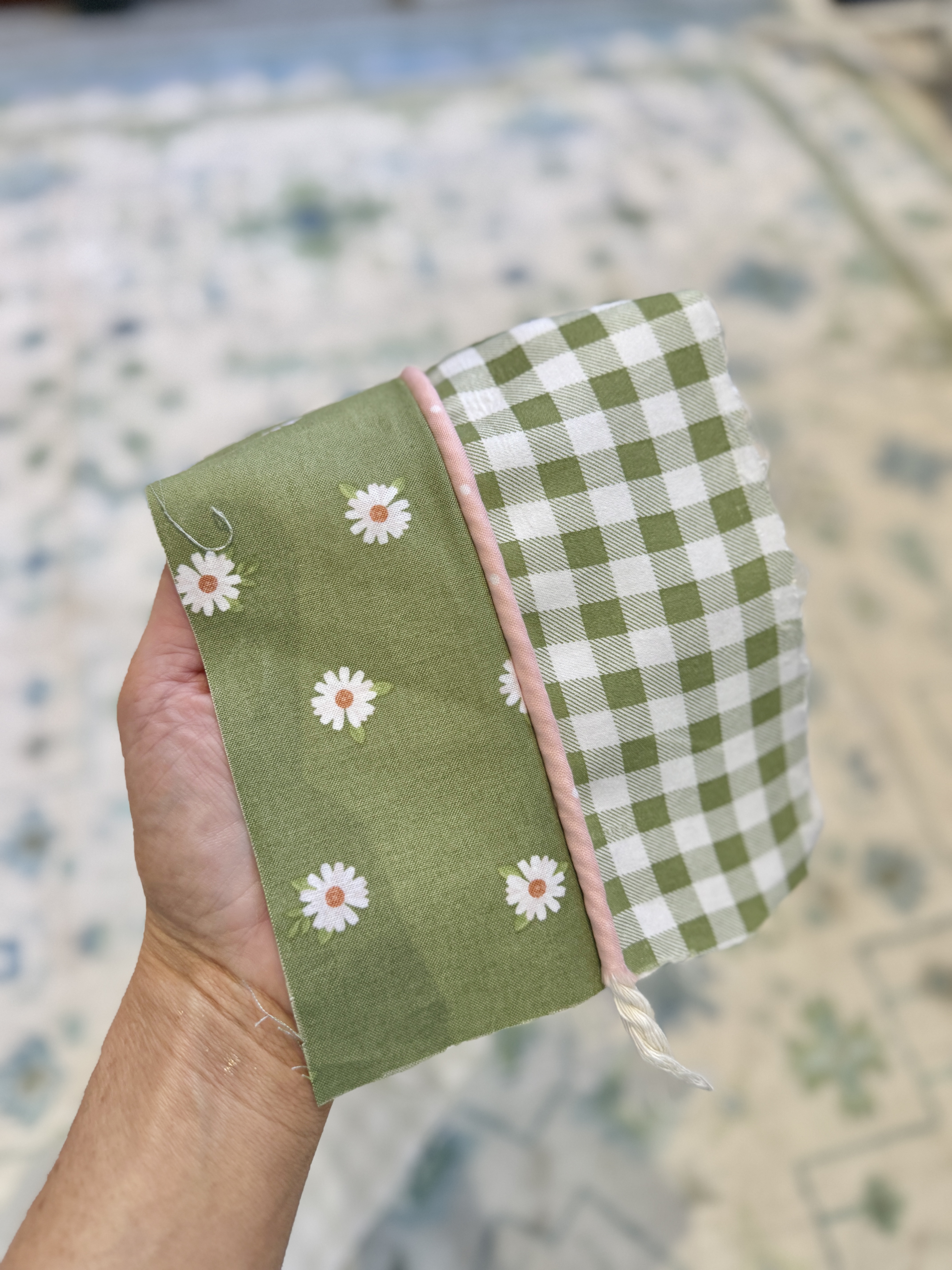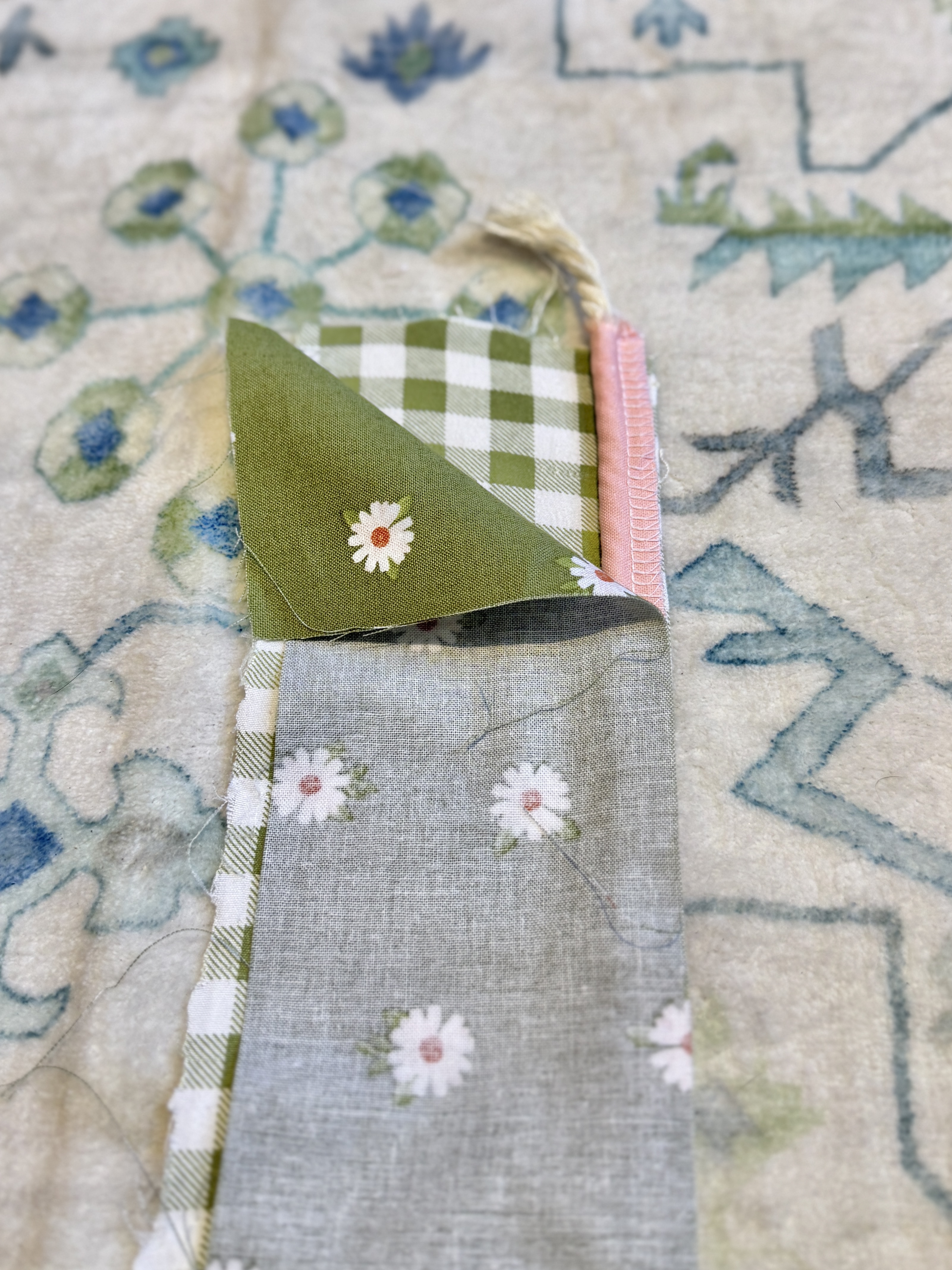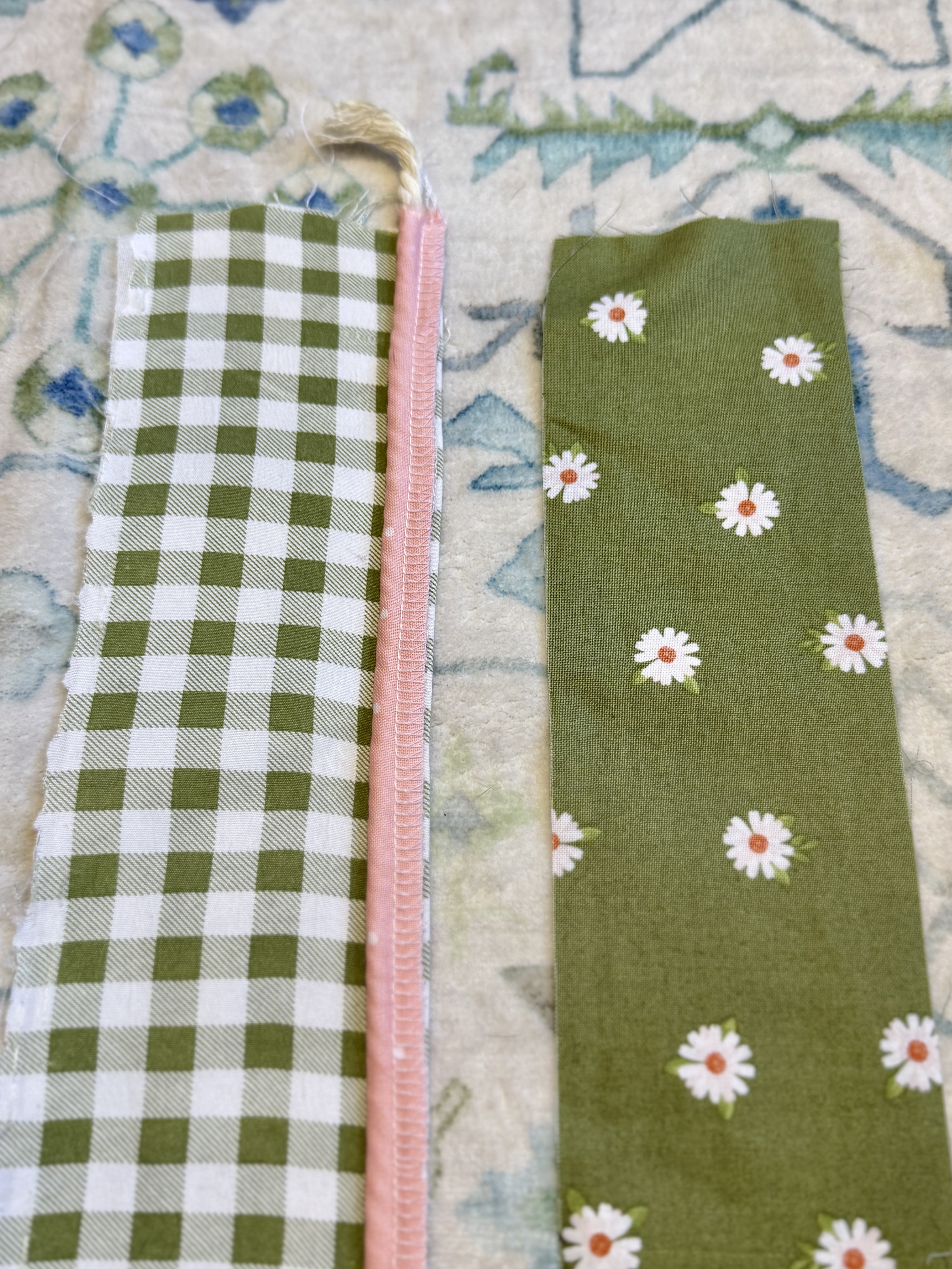 Off I went to search for a coordinating fabric and materials to add a piping trim. As soon as I saw this green floral fabric, I knew it was perfect! I also grabbed some 5mm cording and pink fabric to wrap it in. I am always fond of a surprise pop of print hidden within something handmade. And there’s nothing quite like a crisp piping to make something look expensive.