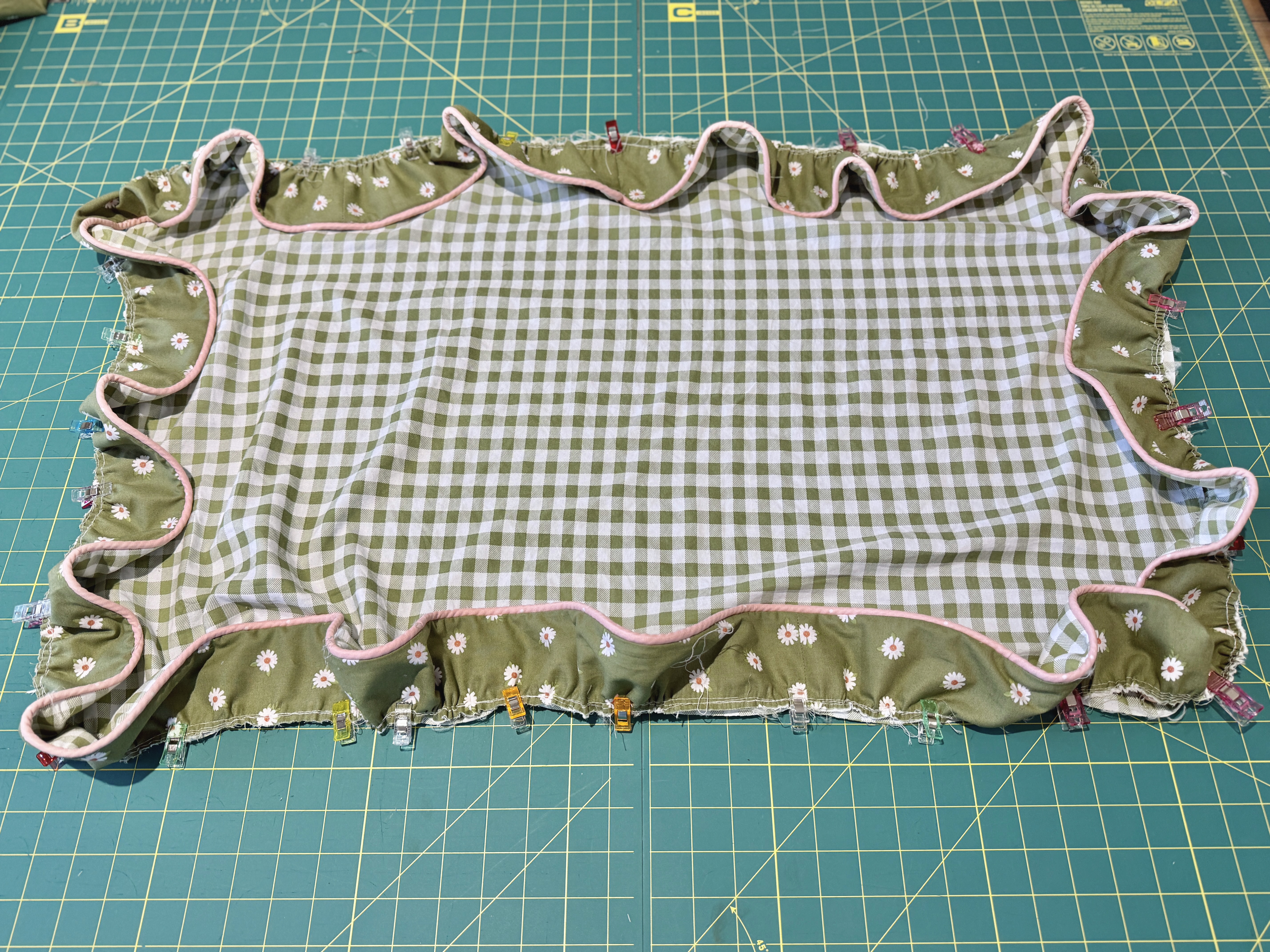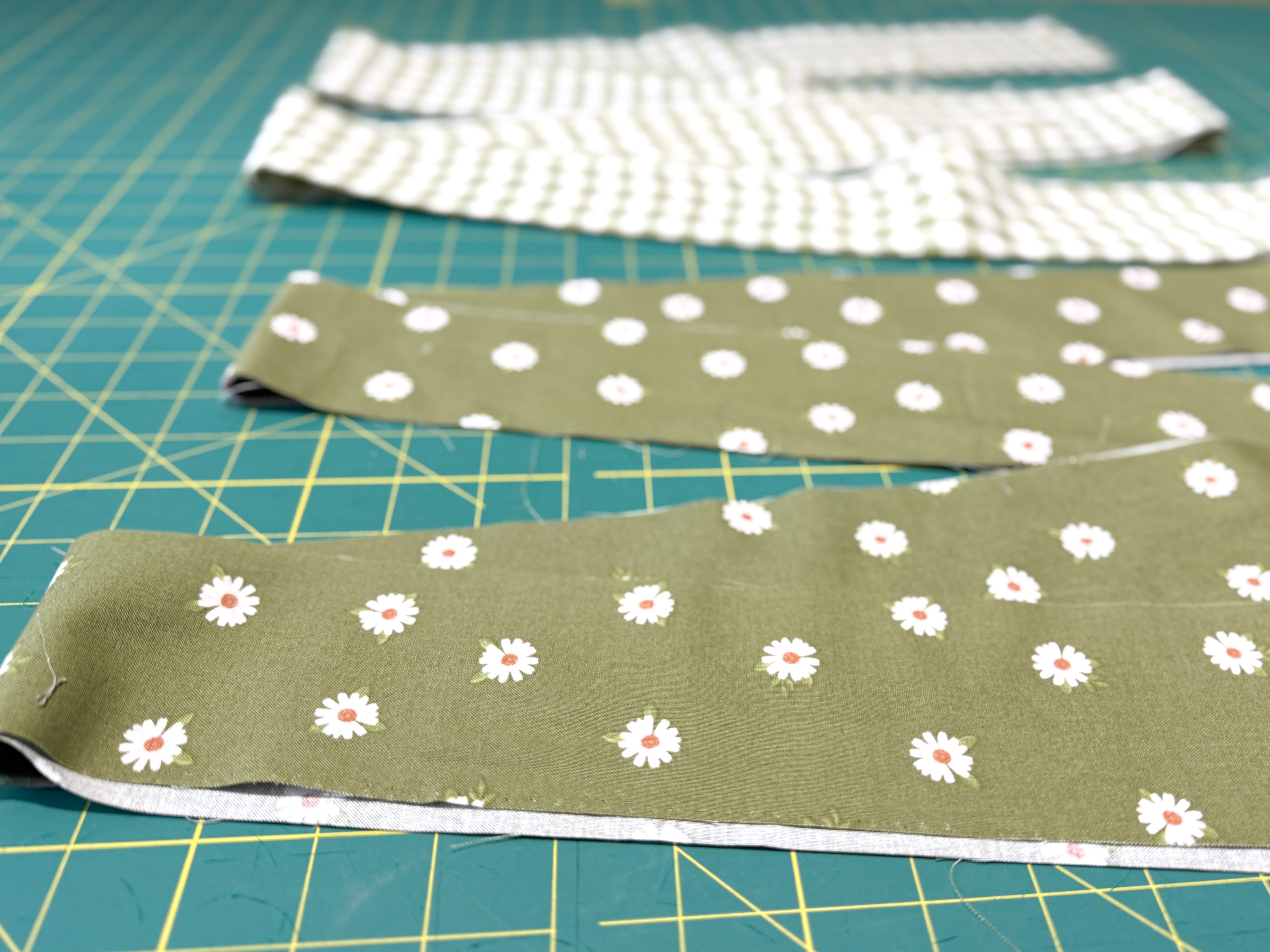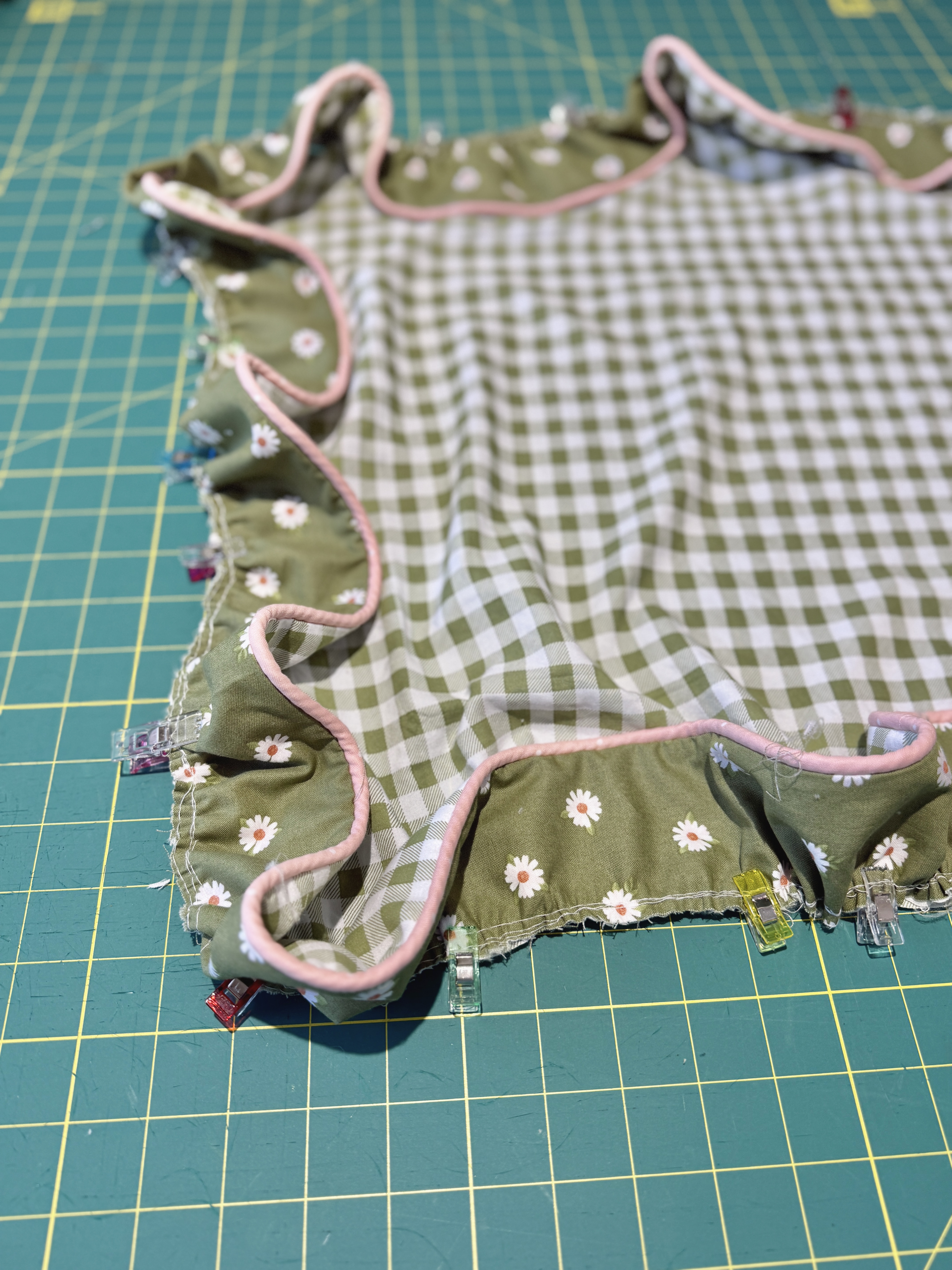 To add some stability to the fabric, I fused lightweight interfacing to the back of the ruffle pieces. The ruffle pieces became the new pattern pieces for the green floral fabric, which I cut out next.