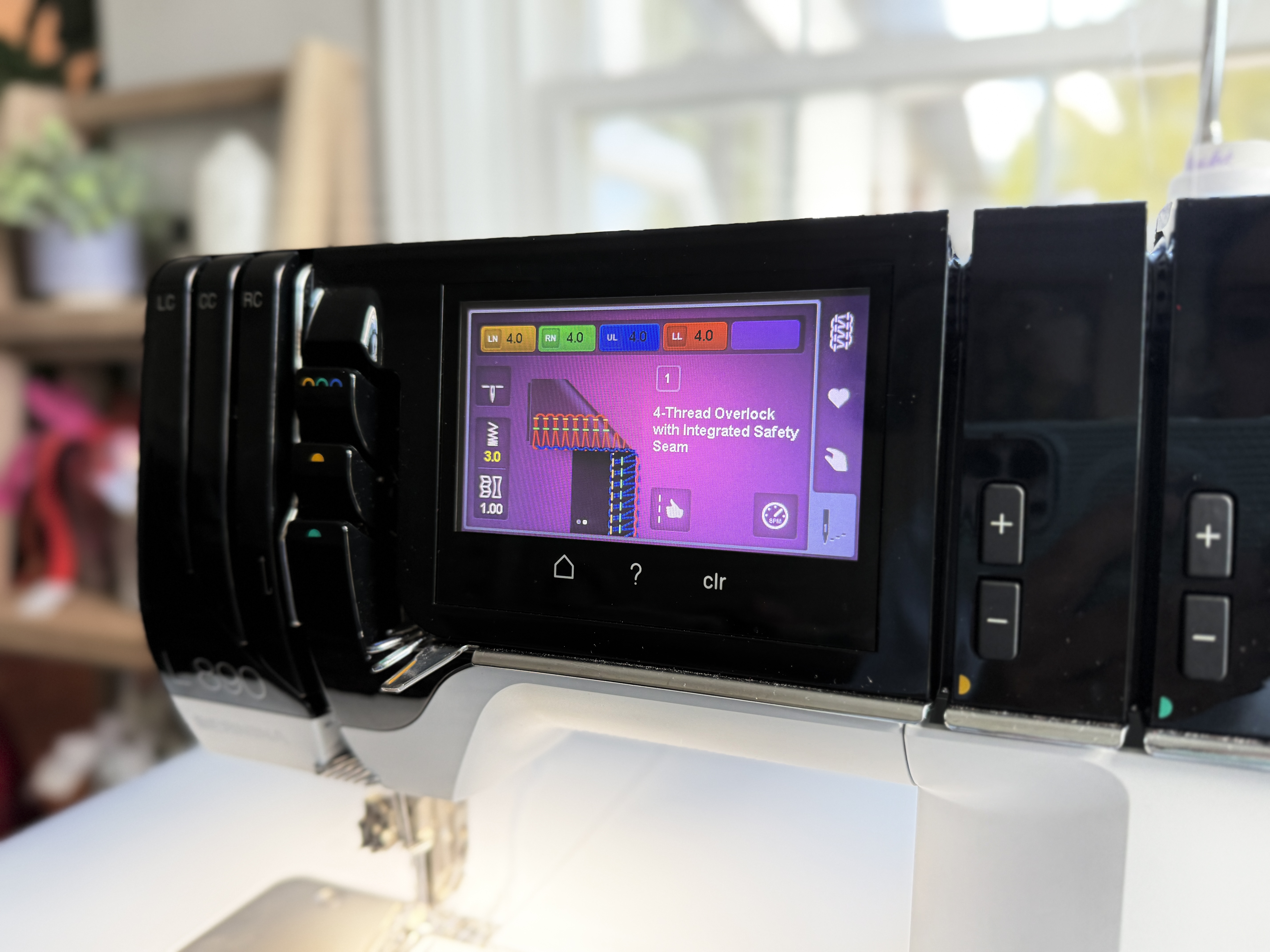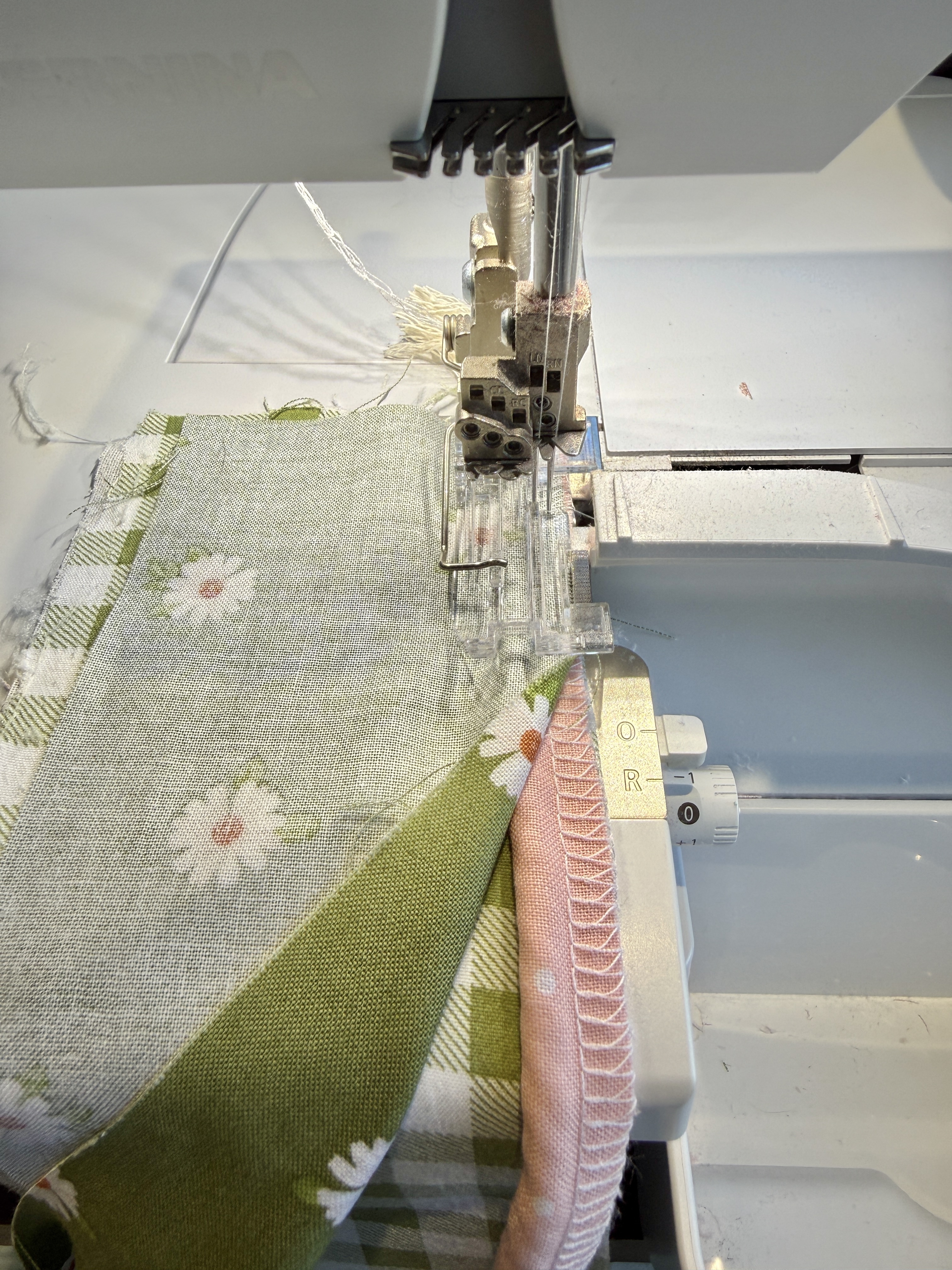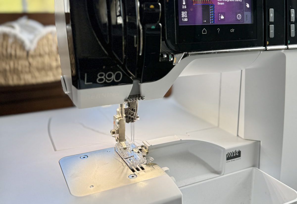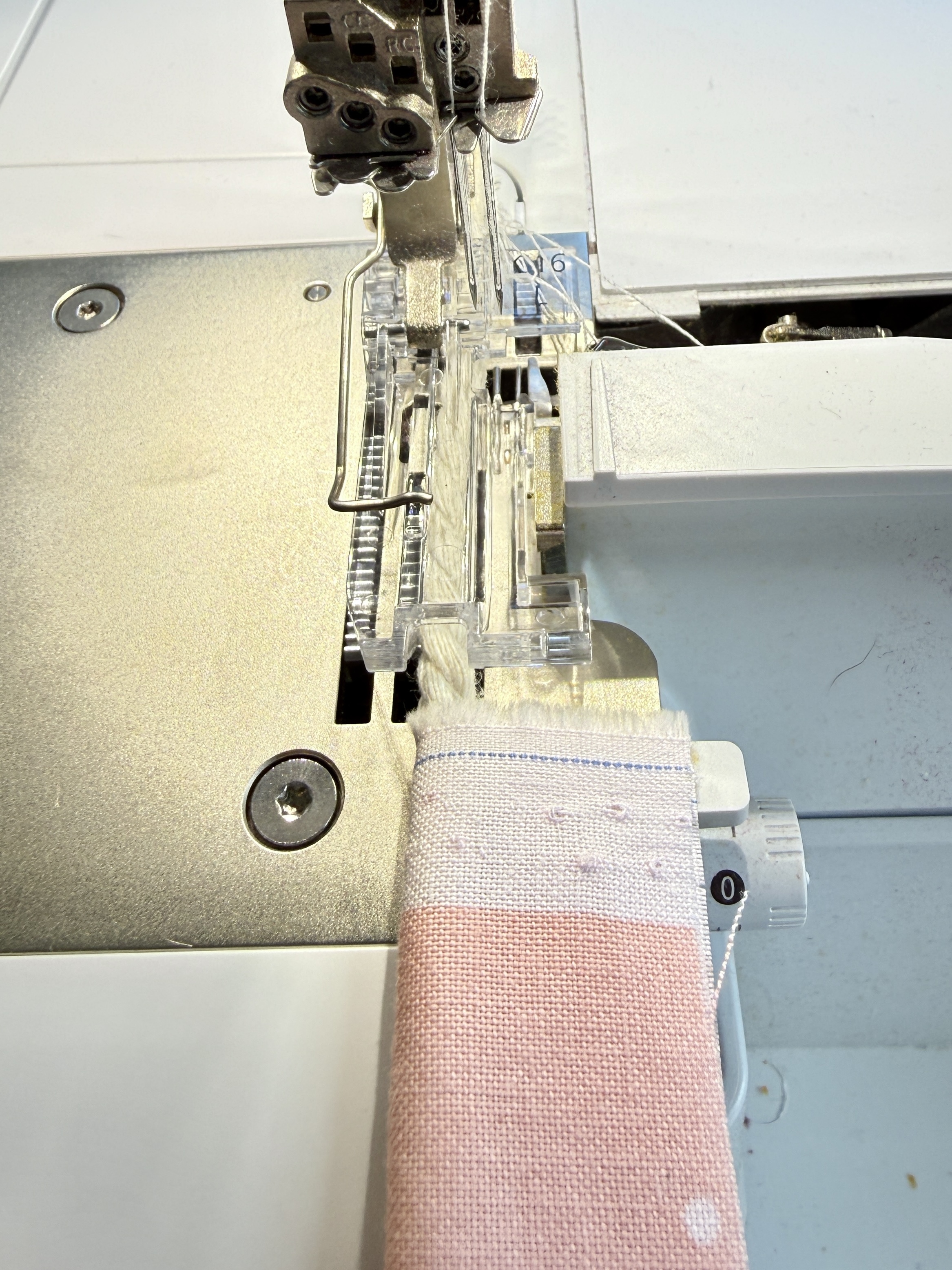 Next, I attached the #C16 L foot to my serger and chose stitch #1, which is the 4-thread overlock with integrated safety seam.