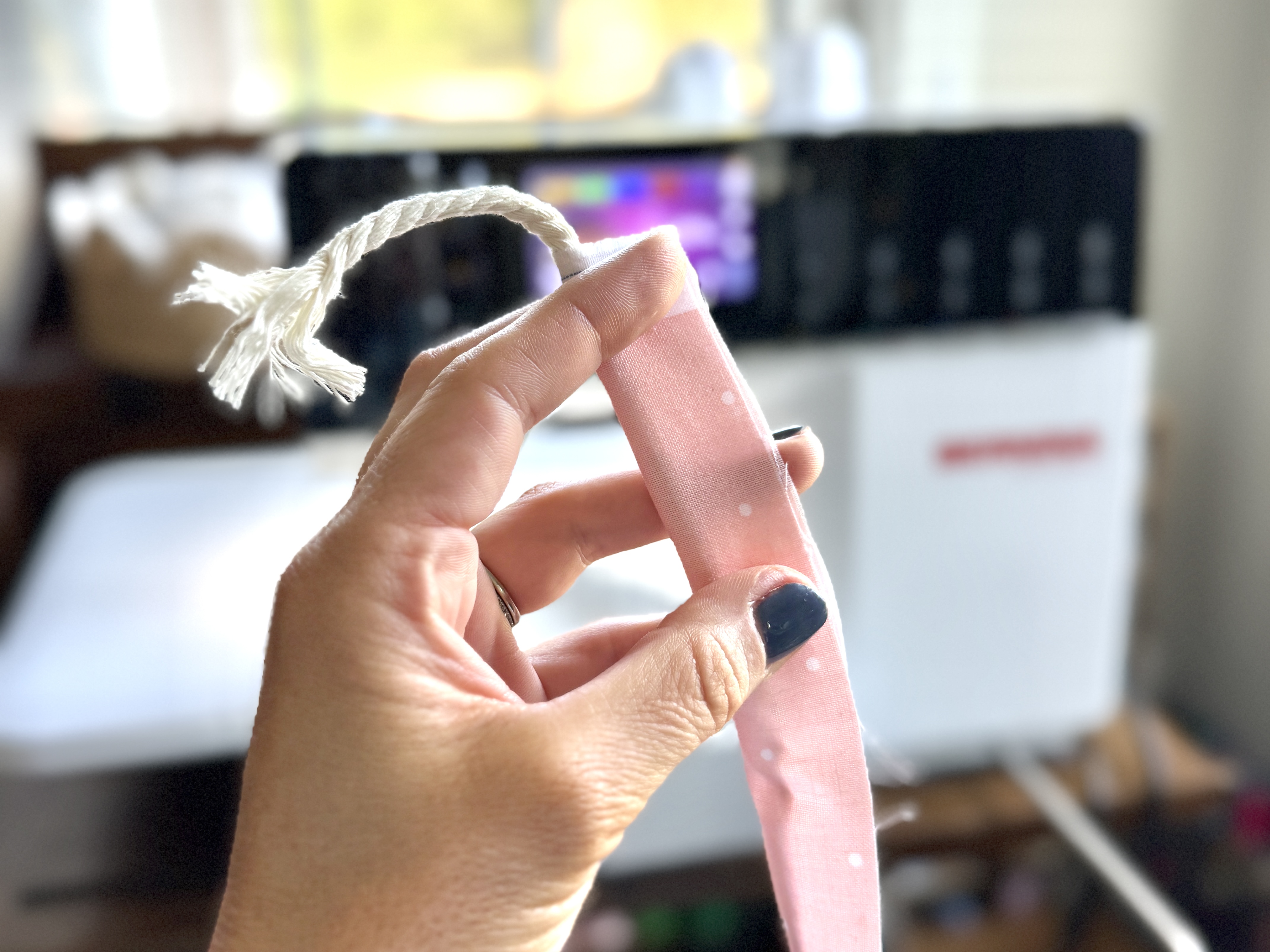 Let’s begin by creating the piping. I first cut a long strip of pink fabric the same length as the ruffle pieces, but with only a width of 2 inches. This strip of fabric will be used to enclose the cording.
