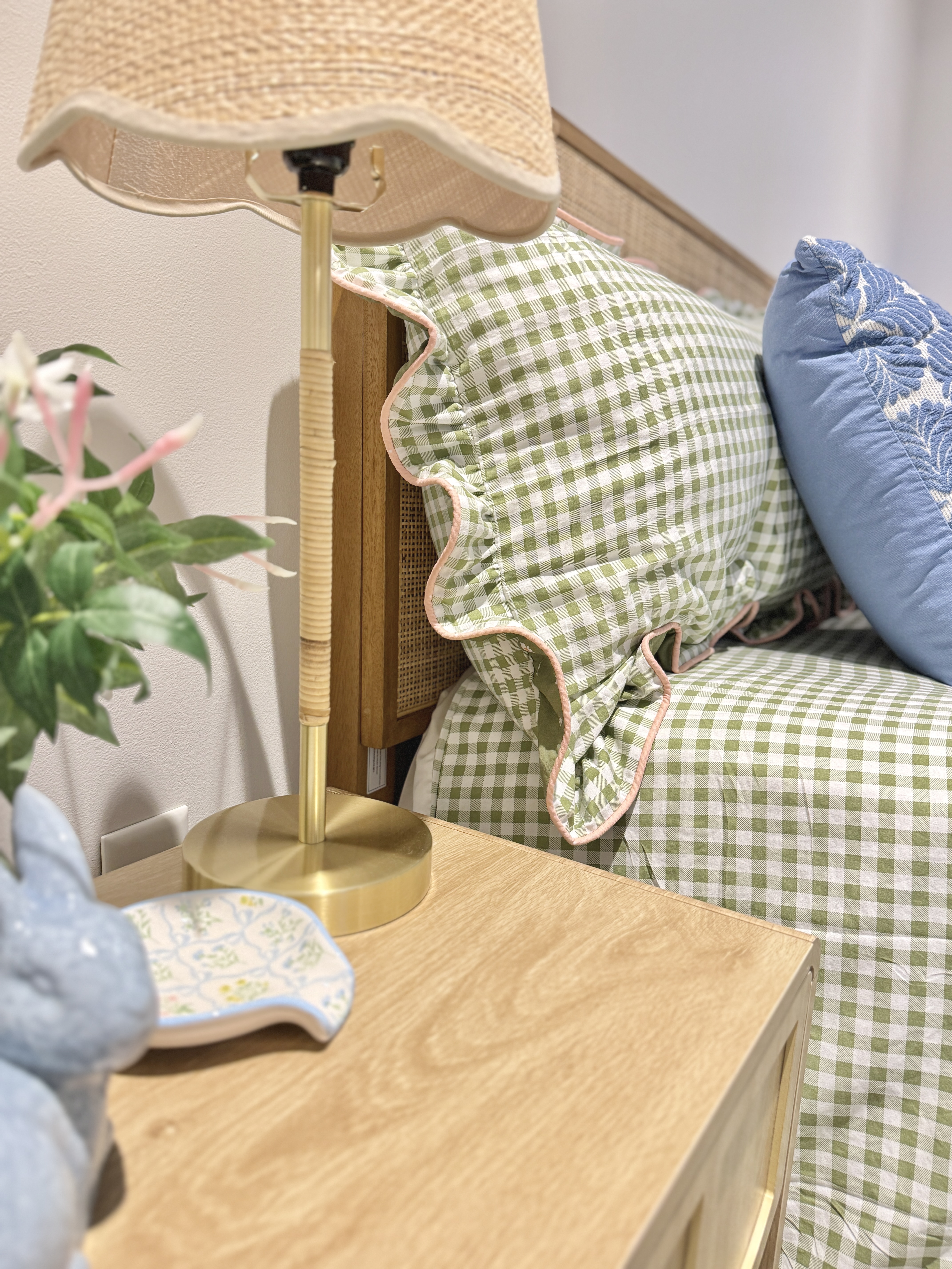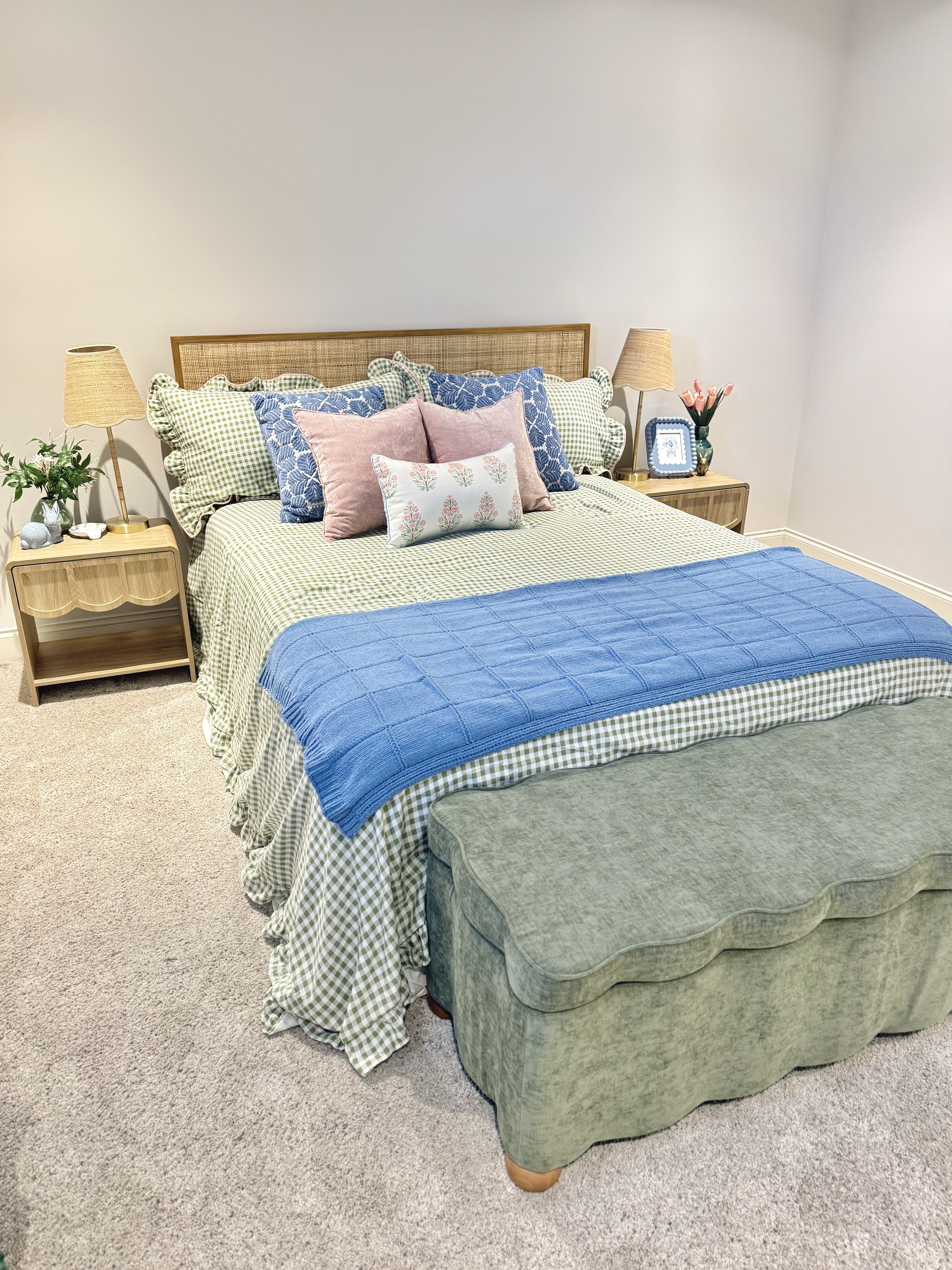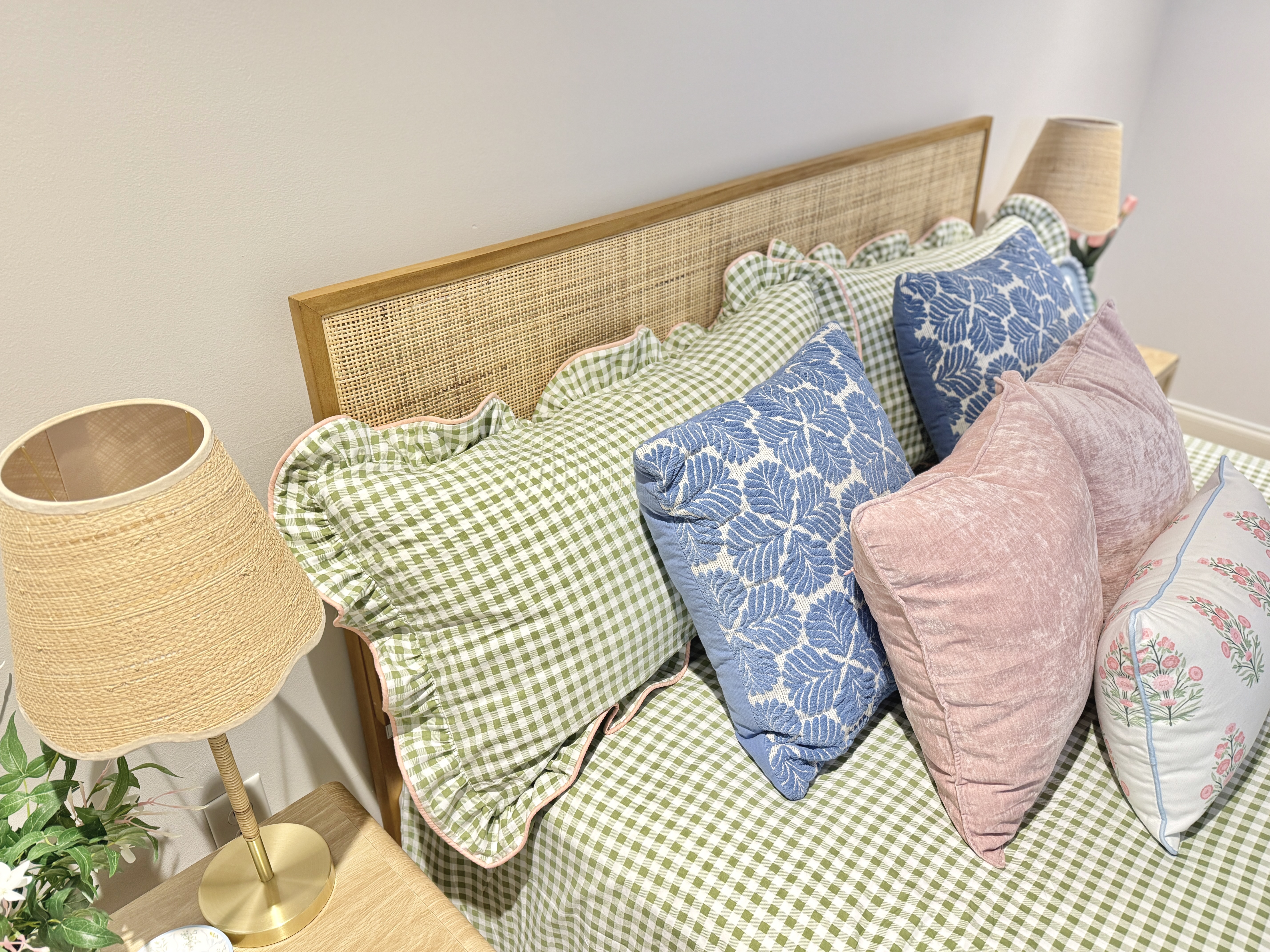 The bedding is the visual anchor of this space and draws the most attention, so I wanted it to pack a punch of color. It took a few tries of deliveries and returns to find one that worked for this space. I specifically wanted a green gingham bedding that featured a ruffle trim like this one from Amazon!