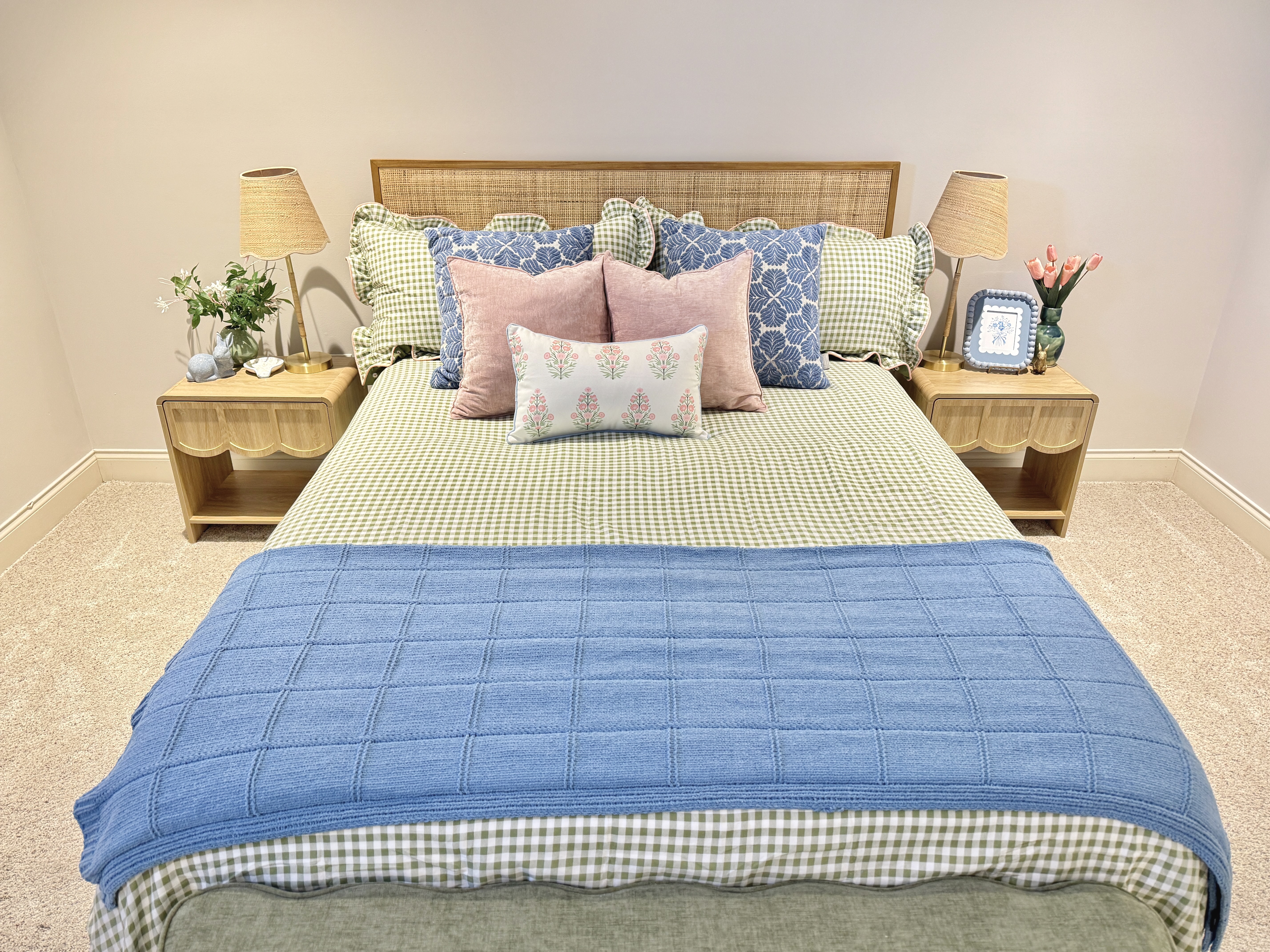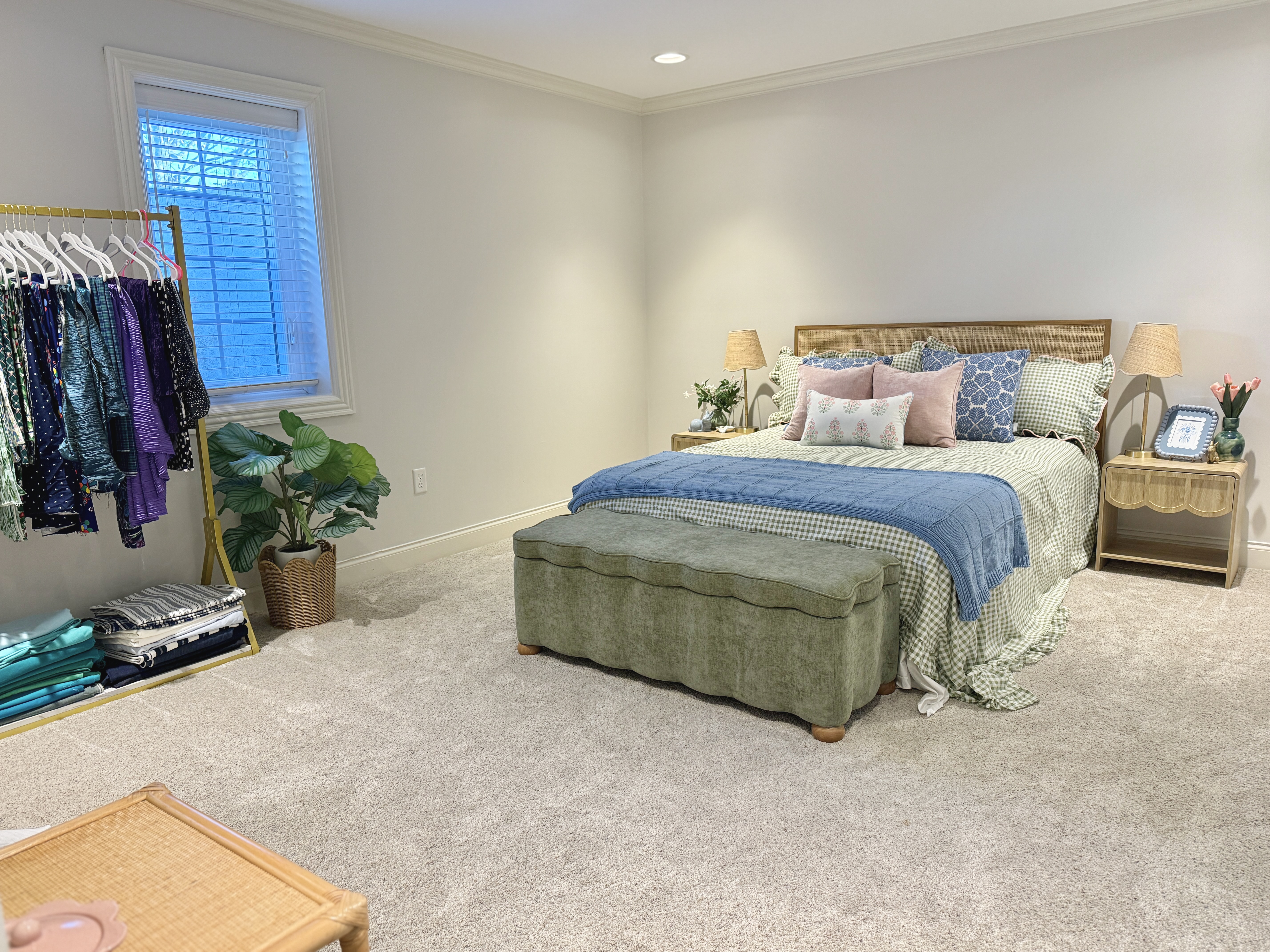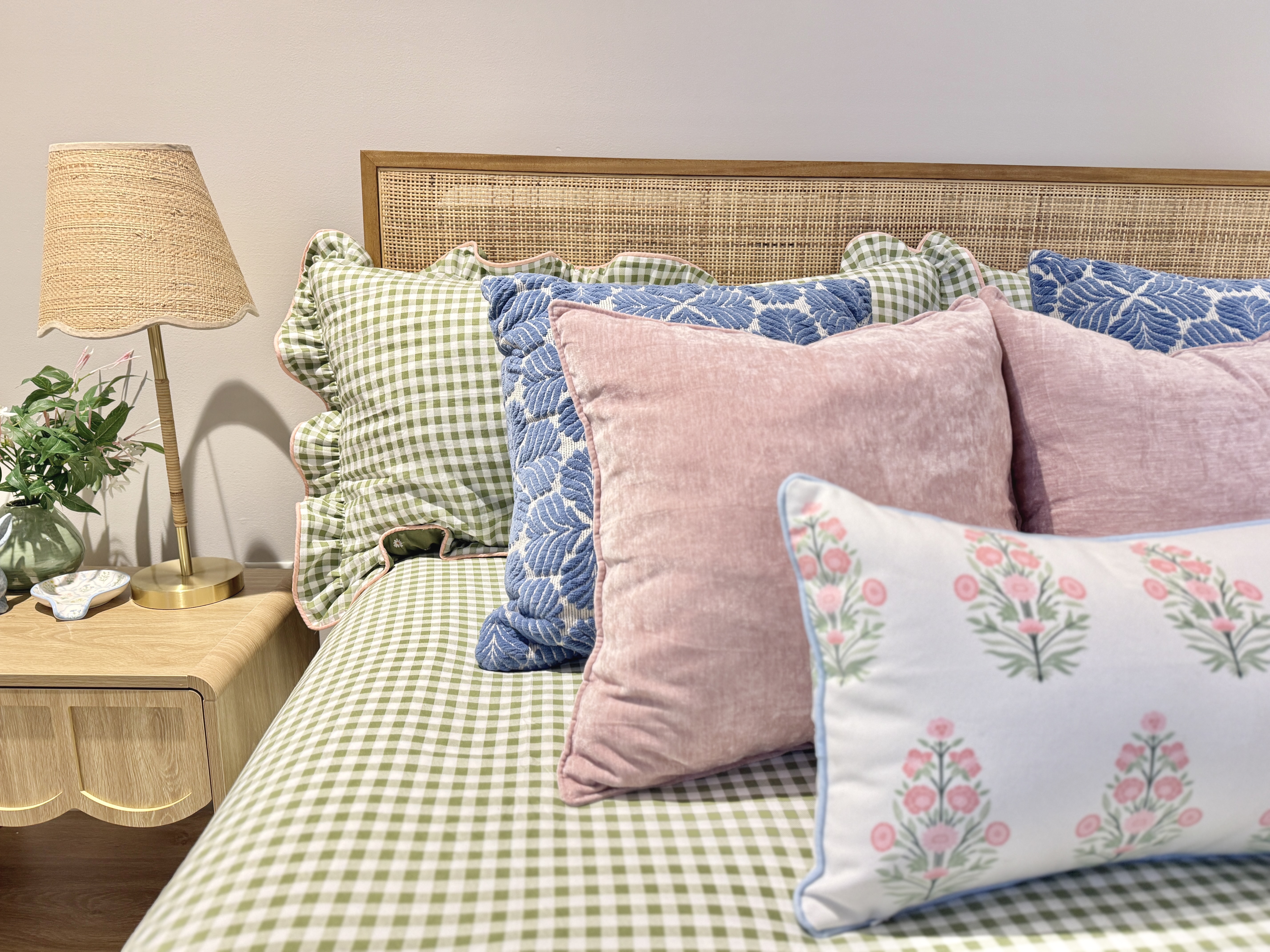 The bedding is the visual anchor of this space and draws the most attention, so I wanted it to pack a punch of color. It took a few tries of deliveries and returns to find one that worked for this space. I specifically wanted a green gingham bedding that featured a ruffle trim like this one from Amazon!