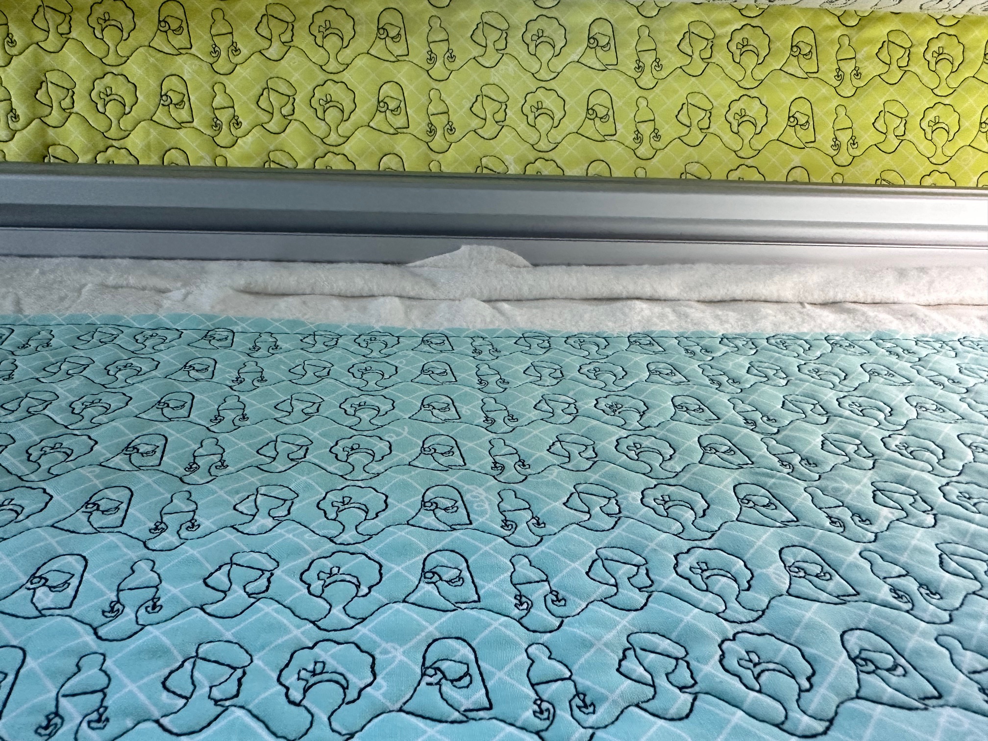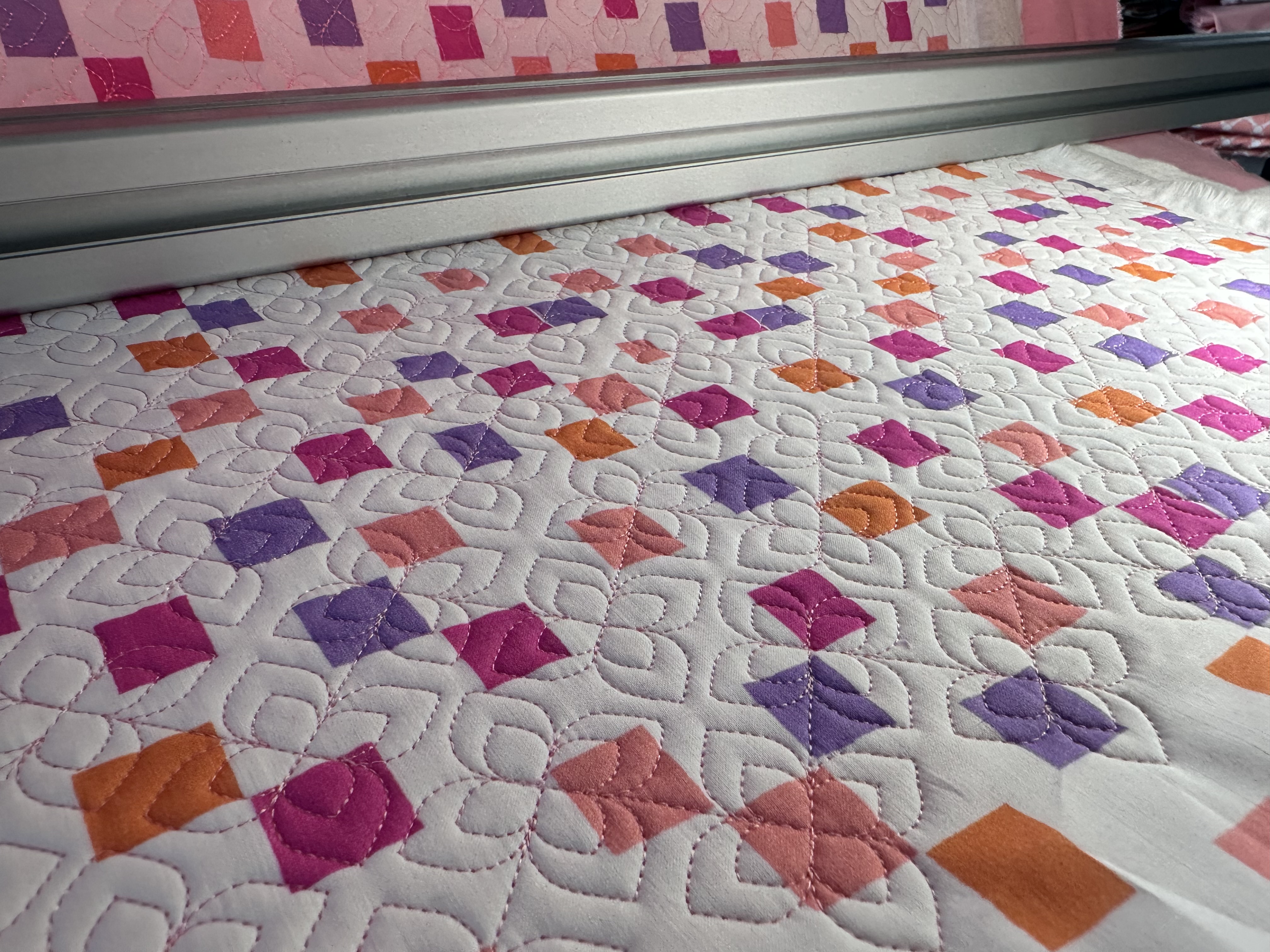 When deciding to quilt up some fabric for a quilted object, it’s important to consider the scale of your design. If you’re using a pantograph, you might want to scale the design down if you’re making a smaller item and want the quilting design to shine. When you cut up your quilted fabric you won’t see as much of the quilting like you would in a traditional quilt, so making a design smaller can prevent the design from getting lost.
