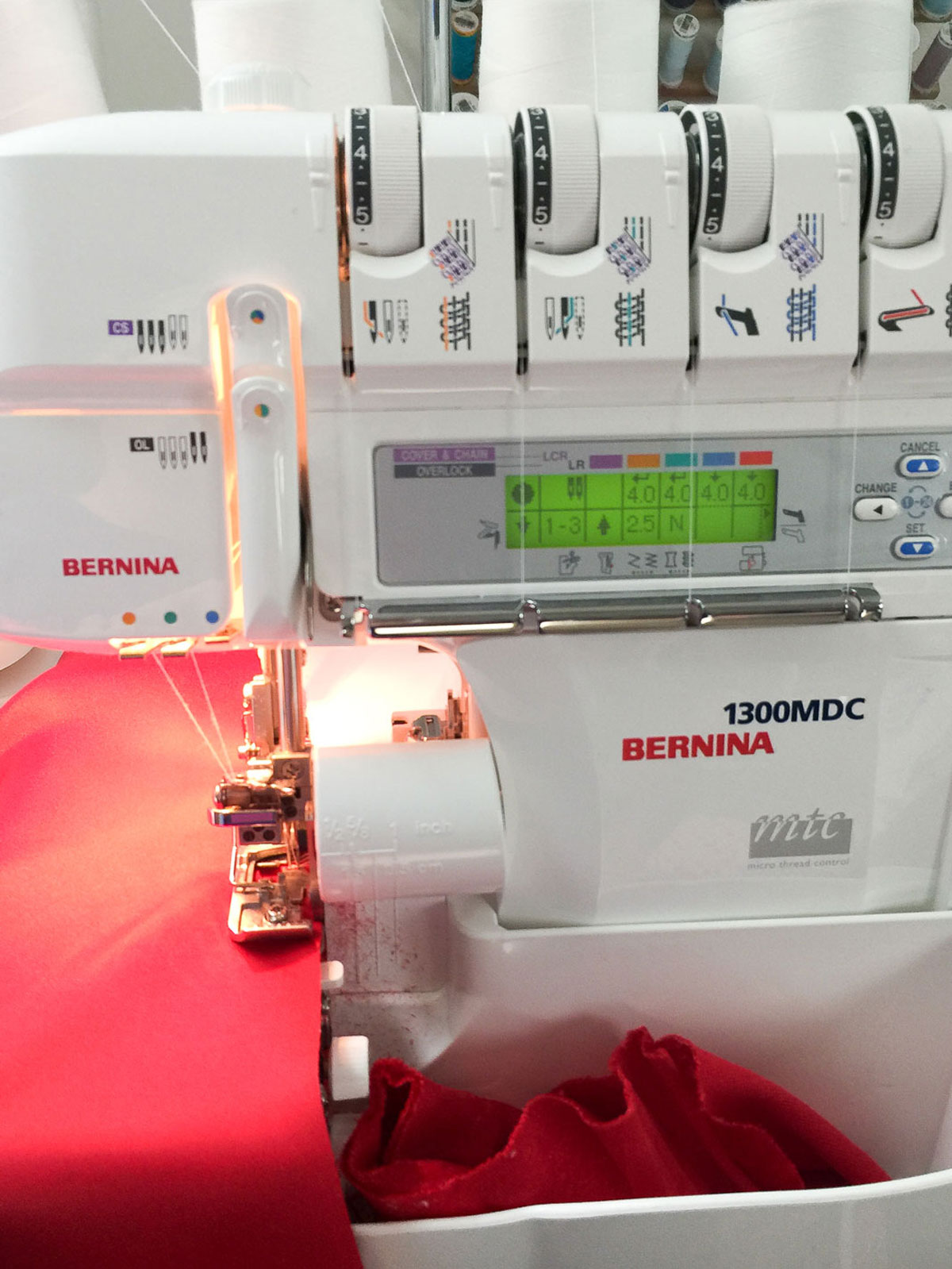 I have a serger that I used for most of my project, if you have one it’s great for this, if not you can use your regular machine. I had my serger set to 4 threads so that it serged and stitched a line all at the same time. Serge/Stitch around the cut edge starting at the fold and ending at the top. I recommend changing your serger thread so that it matches your fabric. I left mine white so that it would show up better in the instructional photos.