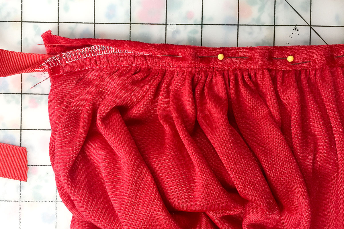 Pin well and stitch using a 1/2″ seam allowance. Serge or zig-zag the raw edge of the fabric.