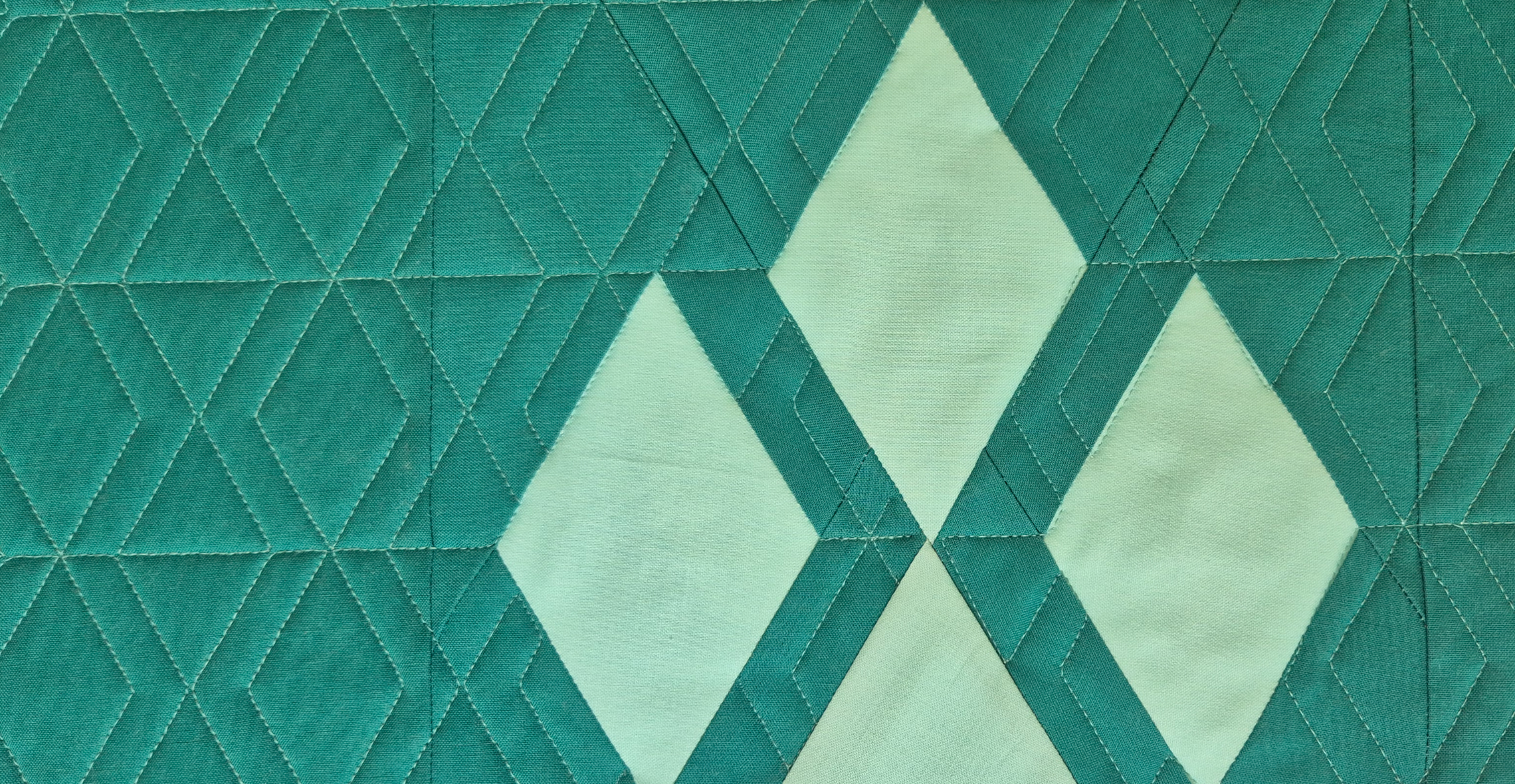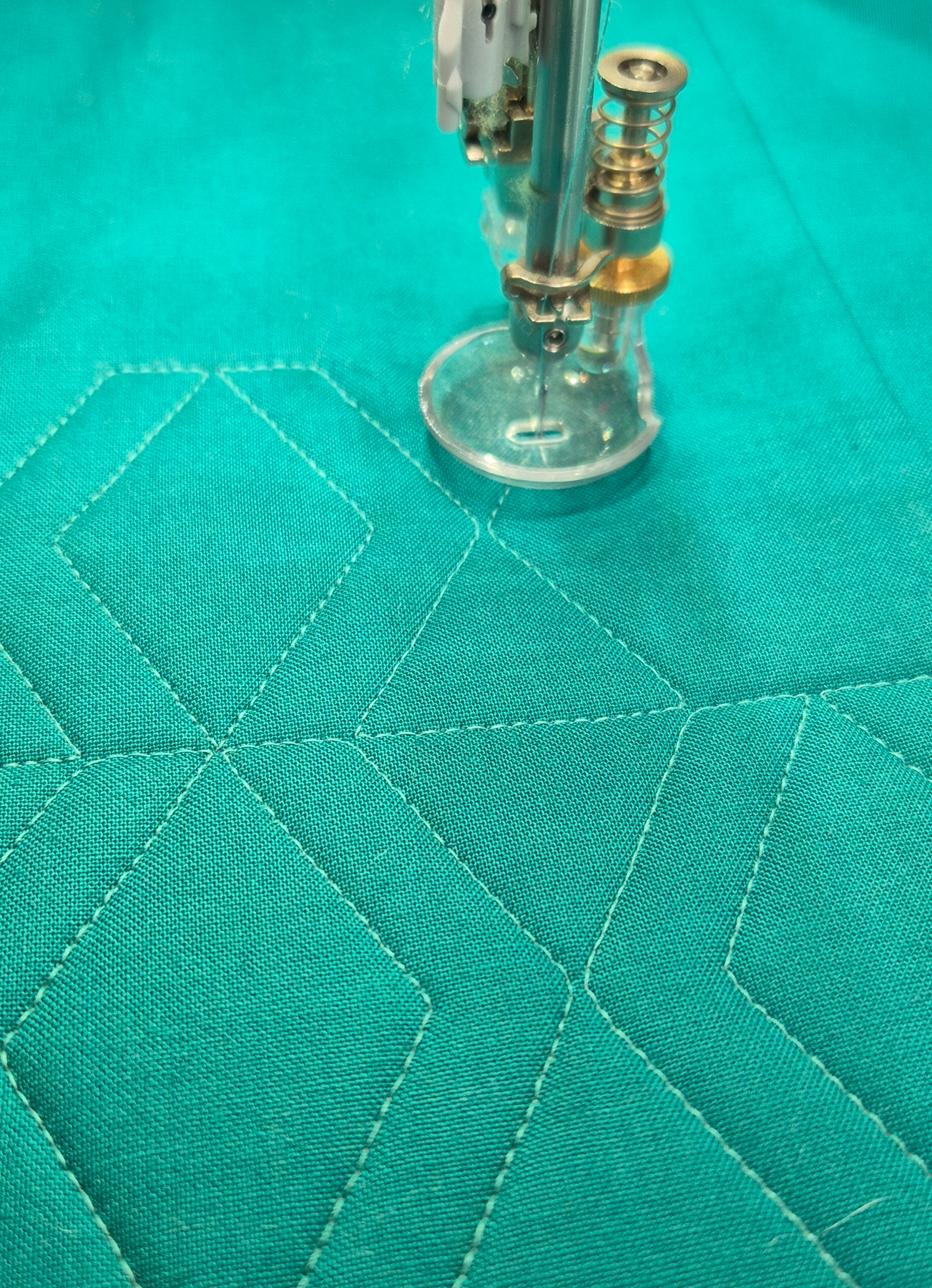 Let’s have some fun with diamonds! To make the design of this row more interesting, I chose to not just quilt diamonds. That is something you can create with straight line quilting. For this row I took the center part of the patchwork we did in this row, the ‘X’ between the diamonds. When you repeat that pattern it creates a wonderful texture on your quilt.