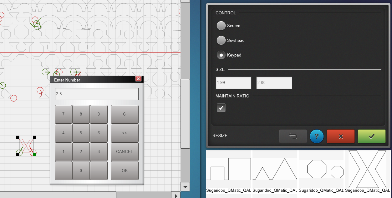 Place the design on your quilt and scale it to 2.5 x 2.5 inches. Our row is 10 inches high, so we are going to fit four rows of the design.
