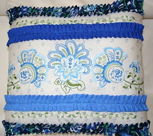 This pillow is based on one in Kay Hickman’s March “All About ME” (Machine Embroidery) webinar. I was afraid the ruffle fabrics would fray away if it were cut with scalloped edges, so I cut 3 1/2 inch strips for my ruffles that I sewed, turned, pressed and ruffled for the pillow. The Gathering Foot #16 would have had a tough time working its magic with the seam allowance down the center of the fabric strip. The Ruffler #86 plowed through perfectly.