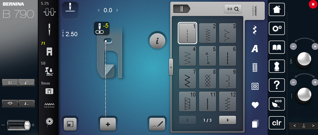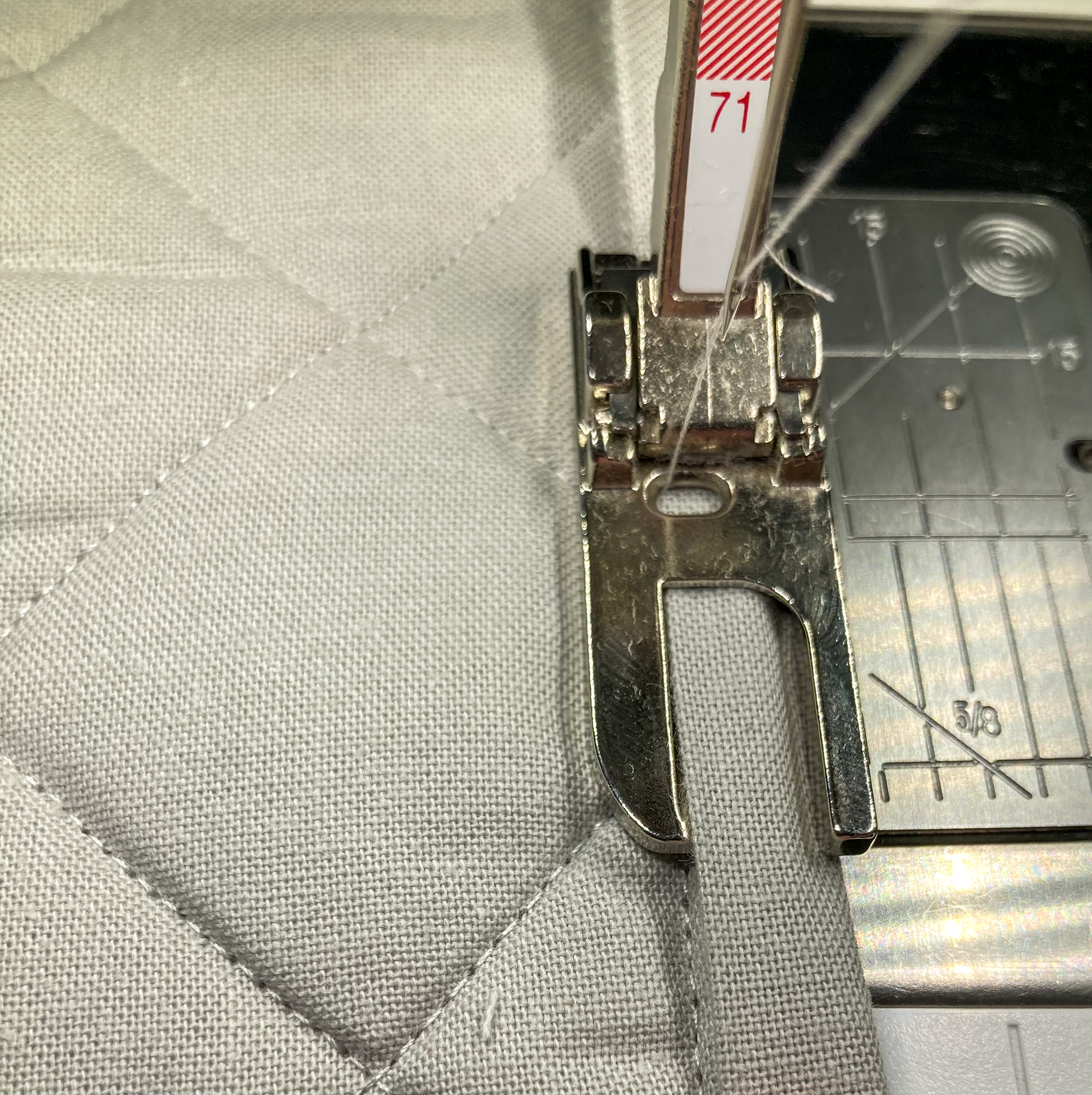 It is now time to quilt it. I just tried to follow the pattern of the fabric. You will want to trim it up so that everything is even. Next, you will take your 2-inch strip for the binding and iron it in half, wrong sides together. We will start the binding next. You will want to bind it with the BERNINA  #71 foot.  The first thing that you will do is move the needle all the way to the left. It should be at -5 as shown below.