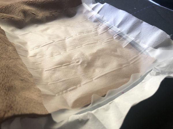 With the StitcH20 I try to remove all the stabilizer gently with tweezers and sometimes, because of the shape of your design, this is all you need to remove the topper! I’m always happy when simply tearing away the topper gets rid of all of it! There may come a day when tearing away all the topper isn’t an option, this happened to be with the snowflake design- there were too many nooks and crannies to remove all the stabilizer! In this case I had to actually get my velvet wet to remove the topper.