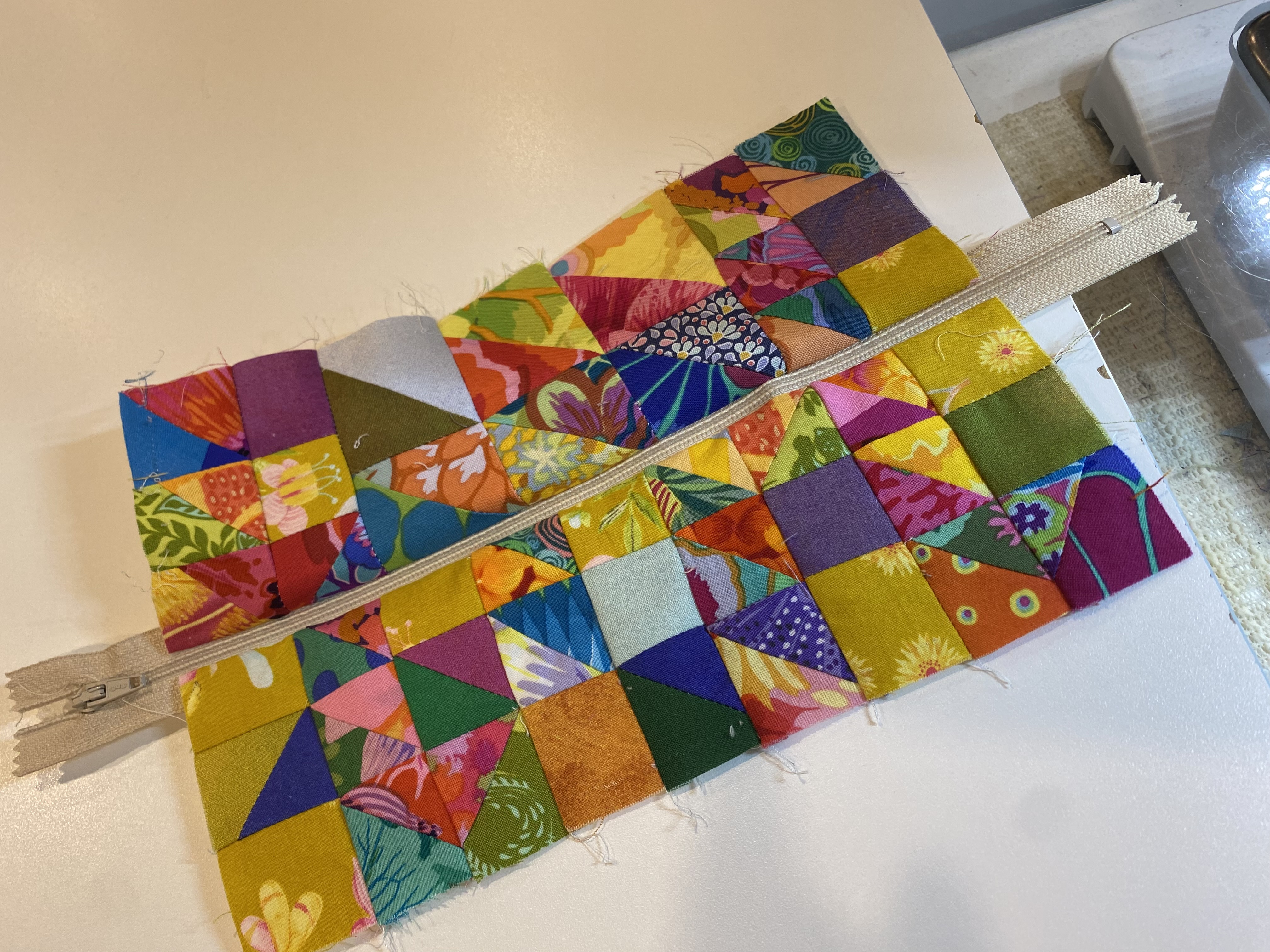 The three zipper pouches each needed a zipper. I used the BERNINA Zipper Foot #4 for each of the pouches. Sadly, this is the only photo I have of the zipper and my (blurry) zipper foot! Rest assured, though, NONE of the zippers were installed without that #4 foot.